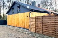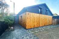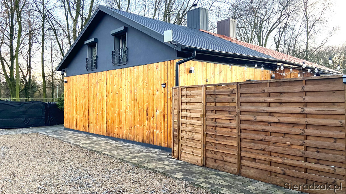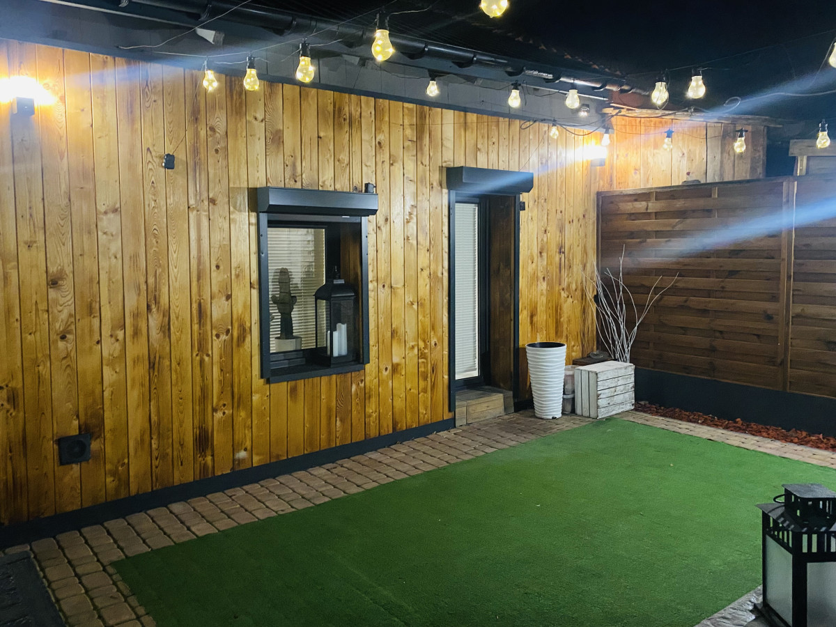 Domy połączone są klimatycznym, oświetlonym tarasem o wymiarach 6x6 m. Tworząc zadaszenie, możemy otrzymać fantastyczny zimowy ogród. Bezpieczeństwo zapewniają monitoring, system alarmowy oraz zewnętrzne antywłamaniowe rolety.