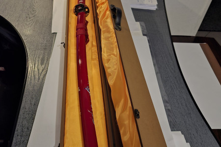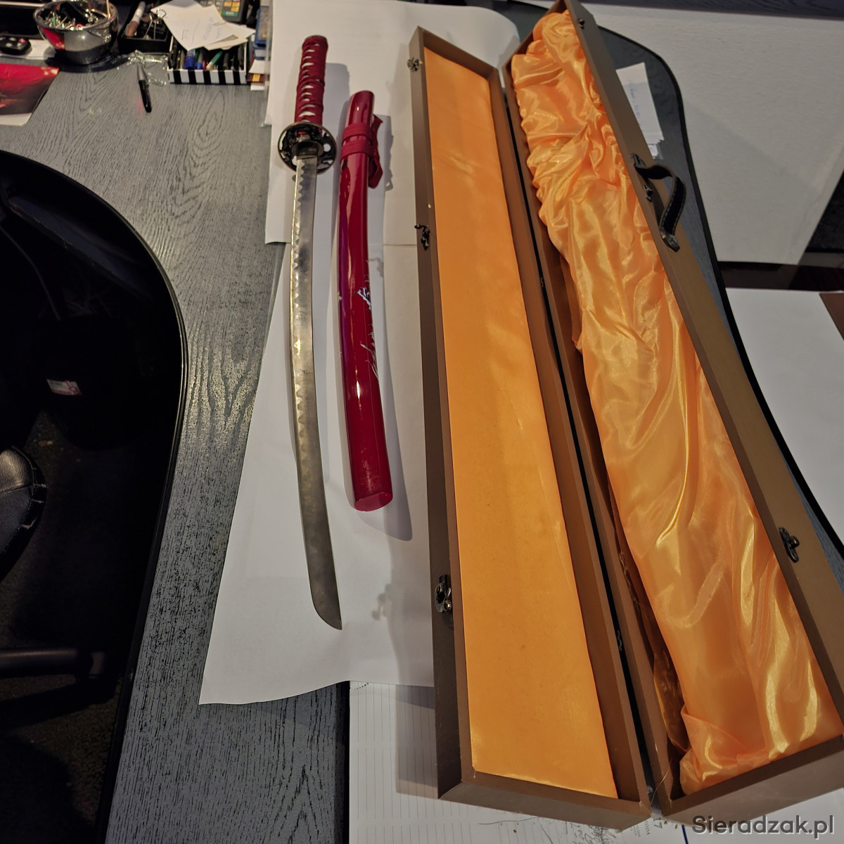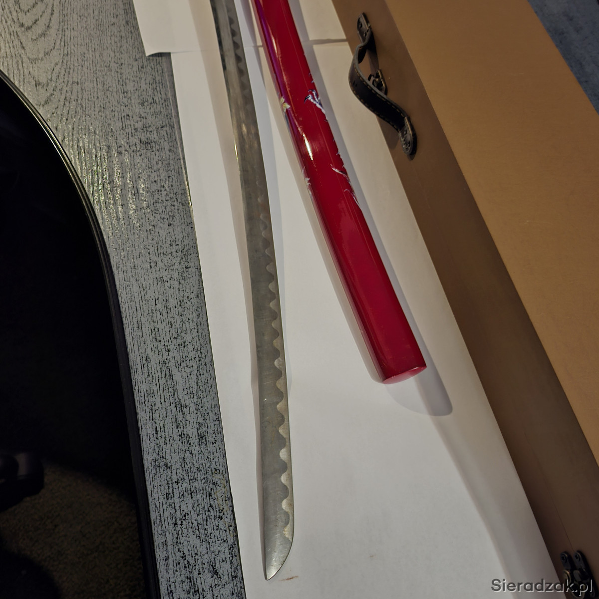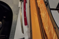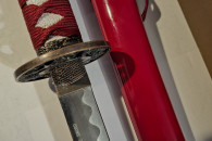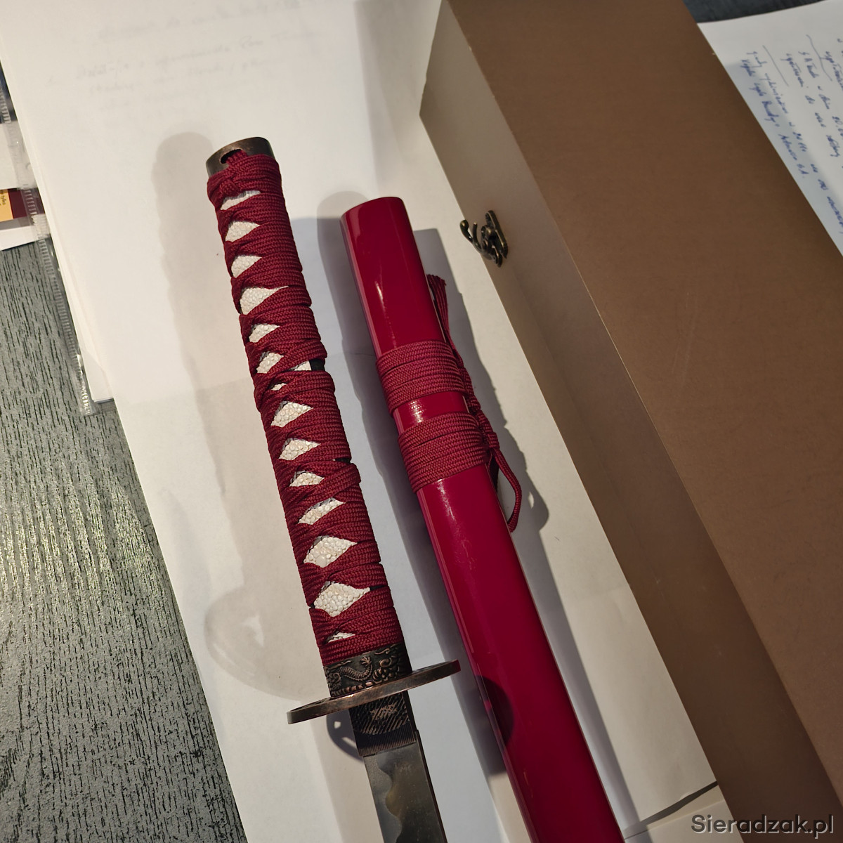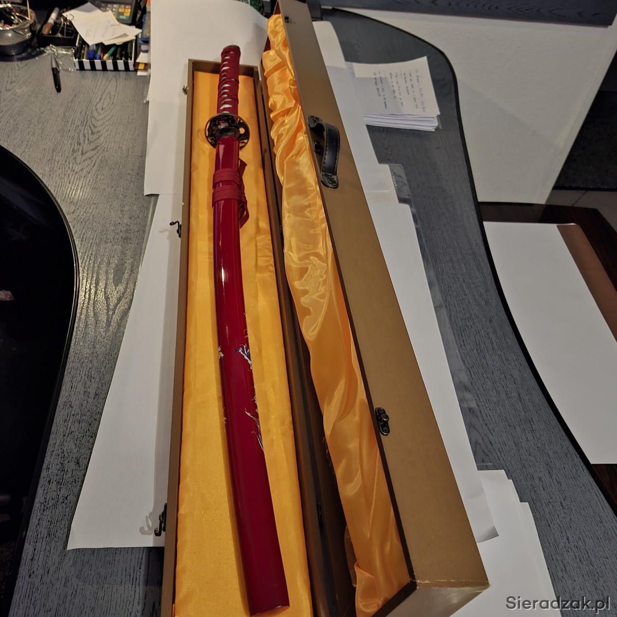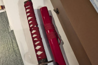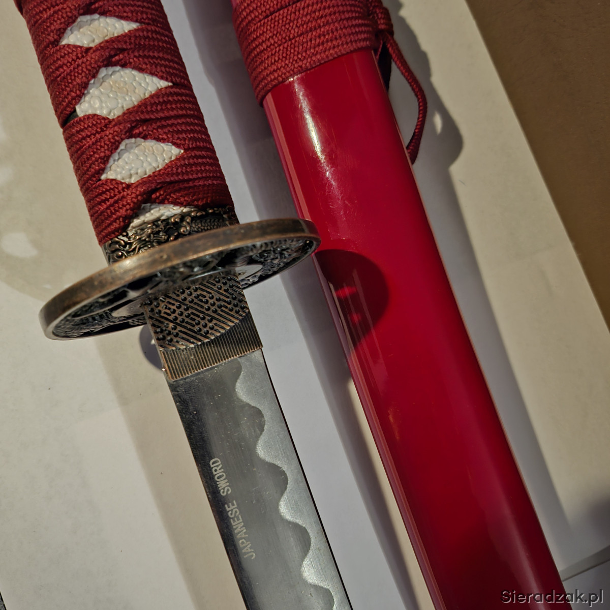 Miecz samurajski. wykonany na wzór katan z XVIII - XIXw. Głownia ze stali węglowej . z wzorem i napisem - japanese sword-.. Tsuba z wizerunkami smoków. Rękojeść owinięta bawełnianą taśmą.. Pochwa pomalowana na kolor wiśniowy. W komplecie ozdobne pudło, zamykane na 3 haczyki. Długość katany w pochwie - 102 cm. Dłudość pudła - 110 cm.