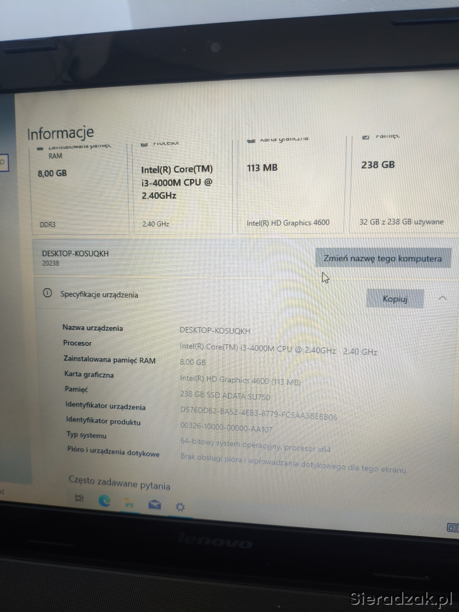 Dzień dobry na sprzedaż mam laptop Lenovo G510 z procesorem Intel Core i3-4 generacji, 8gb pamięci RAM oraz szybki dysk SSD 238Gb.