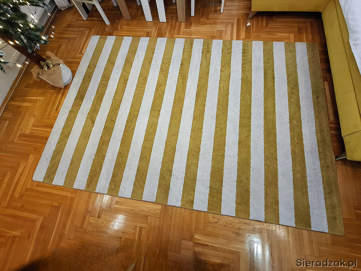 Sprzedam dywan w złoto-białe pasy o wymiarach 200x290 cm.