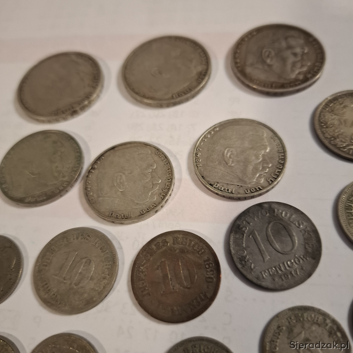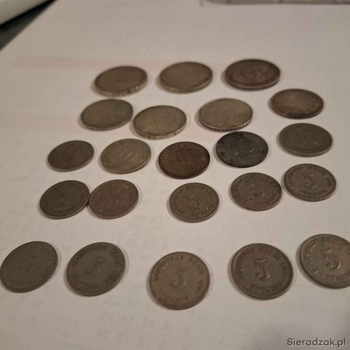 Zestaw 22 szt. starych monet - w tym ' 5 marek - 3szt. -- 2 marki - 3 szt. --1 marka - 1 szt. --10 fenigów - 5 szt. - 5 fenigów -10 szt.