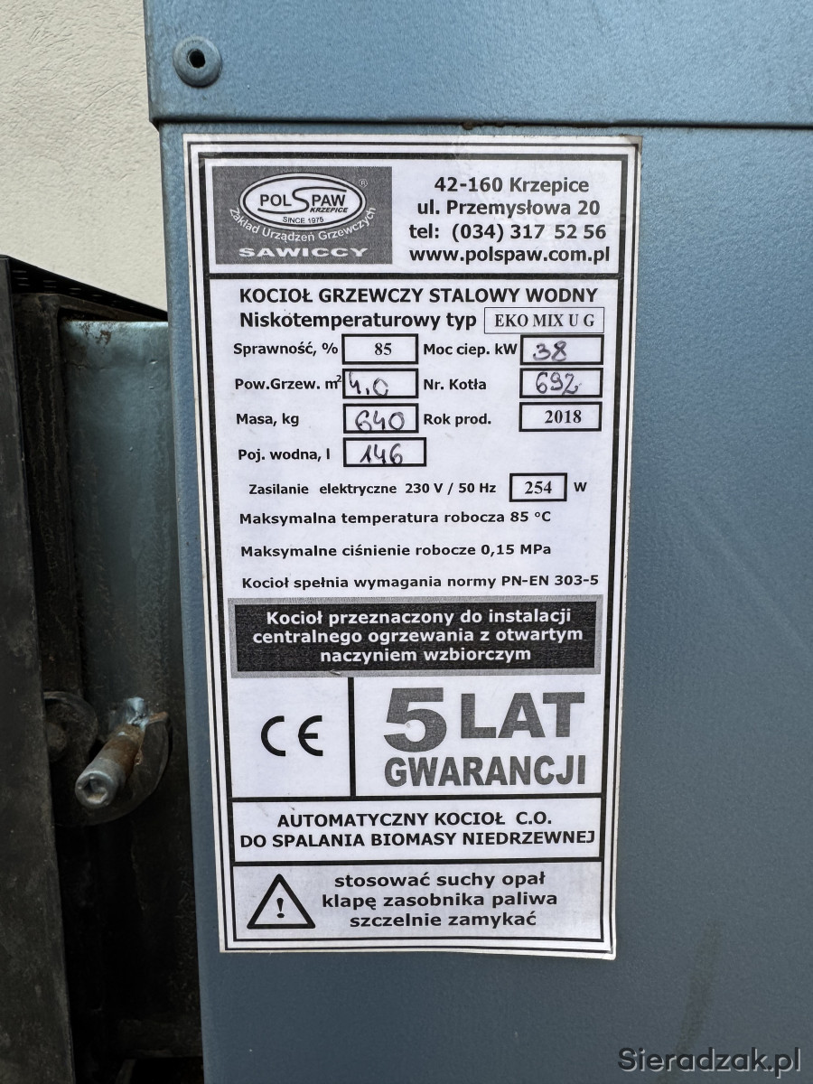 Sprzedam piec 38kW z 2018 roku, podajnik i zasyp malo używany w bardzo dobrym stanie, brak pompki