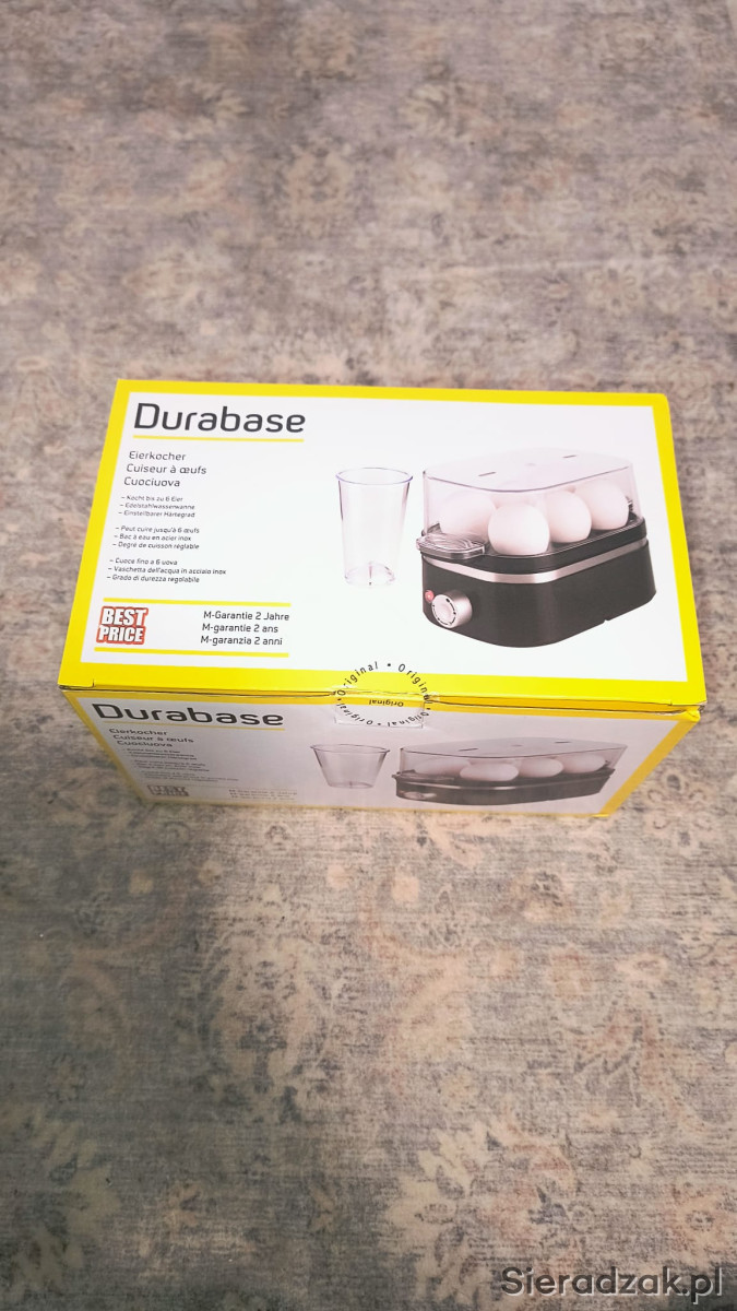 W zestawie znajduje się miarka do wody z nakłuwaczem do jajek.