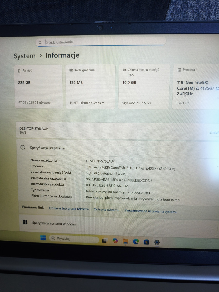 Procesor Intel core i5-11 generacji, 16gb pamięci ram oraz szybki dysk SSD 256gb M2.