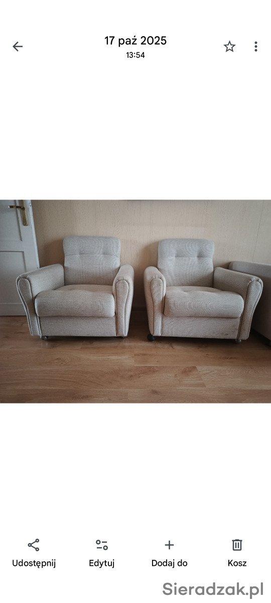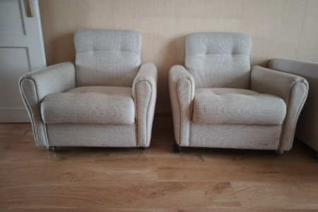 Do sprzedania 2 fotele używane w jasnej tapicerce do lekkiego odświeżenia. Cena dotyczy 2 sztuk.