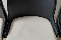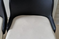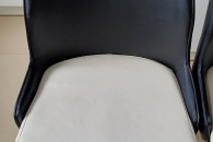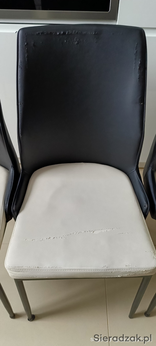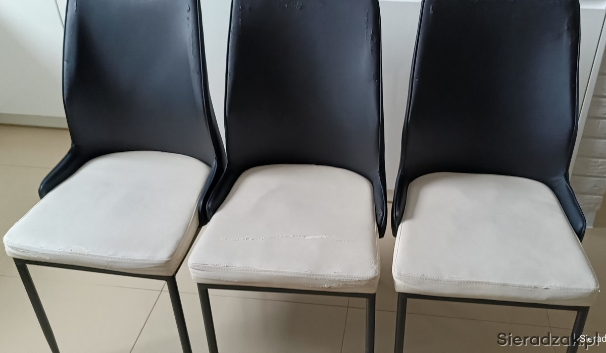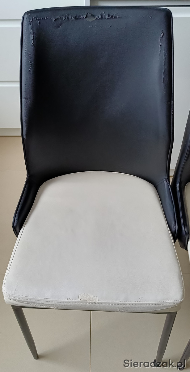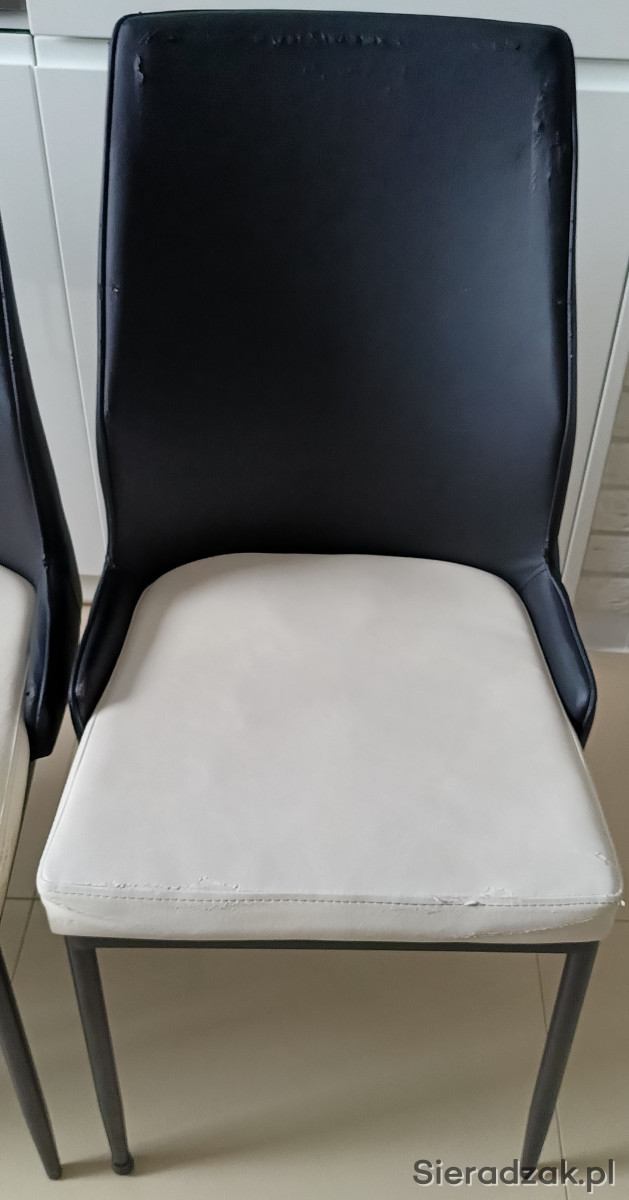 Kolor czarno – białe. Wysokość całkowita 91 cm, wysokość do siedziska 46 cm, szerokość siedziska 43 cm w najszerszym miejscu, wysokość oparcia 48 cm. Materiał eko-skóra i metal.
