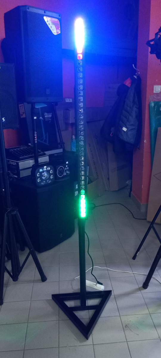 Dostępne też inne Efekty świetlne, reflektory PAR LED, listwy bar, głowy ruchome, stroboskopy, wytwornice dymu i baniek, statywy oświetleniowe.