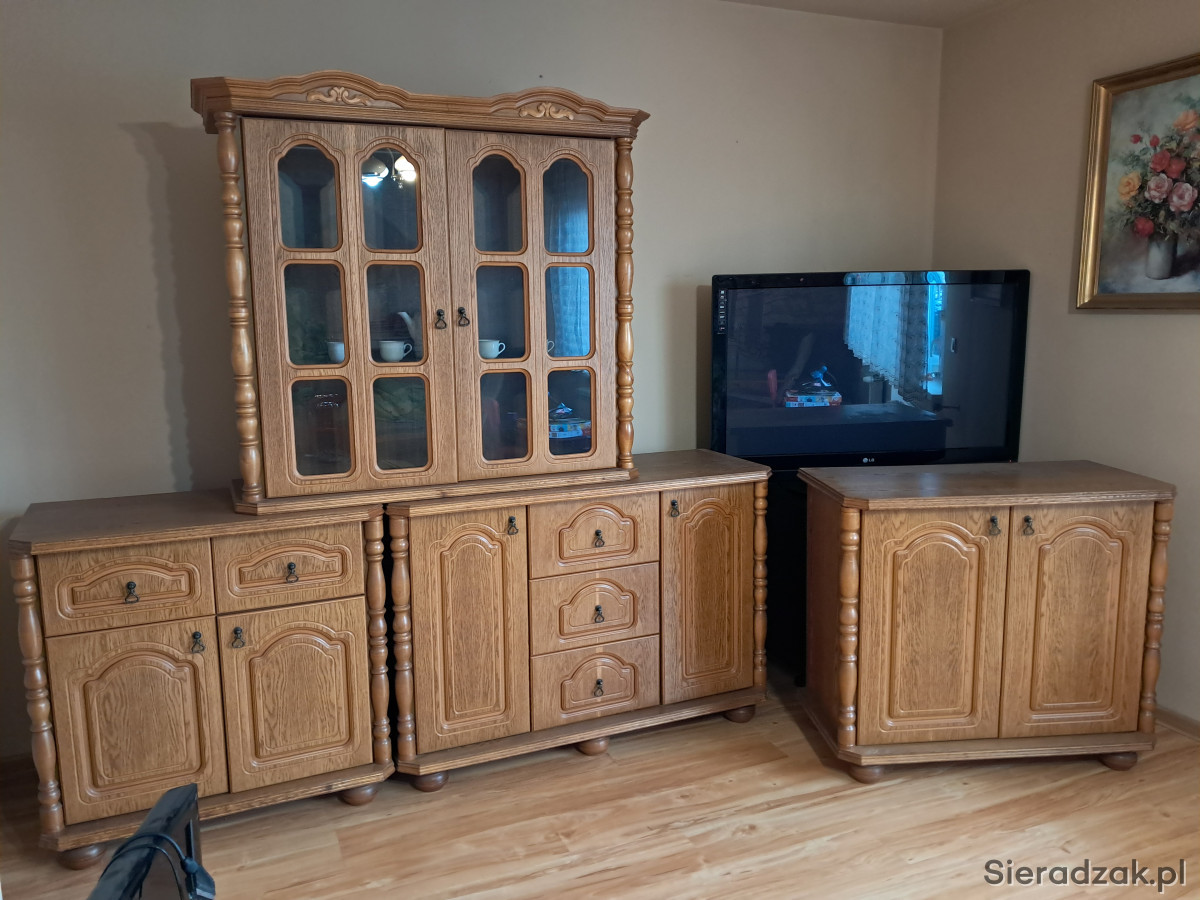 Meble do salonu - komoda i kredens w stylu klasycznym. Wykonane z drewna, posiadają zdobienia i przeszklone drzwiczki. Mebel w dobrym stanie, gotowy do użytku.