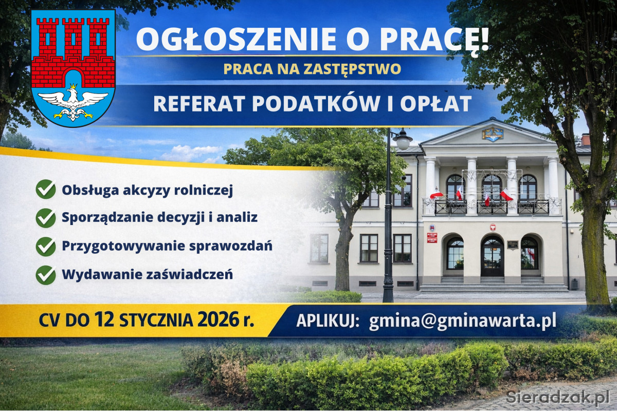 Urząd Miejski w Warcie poszukuje pracownika na zastępstwo na stanowisko urzędnicze w Referacie Podatków i Opłat