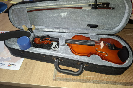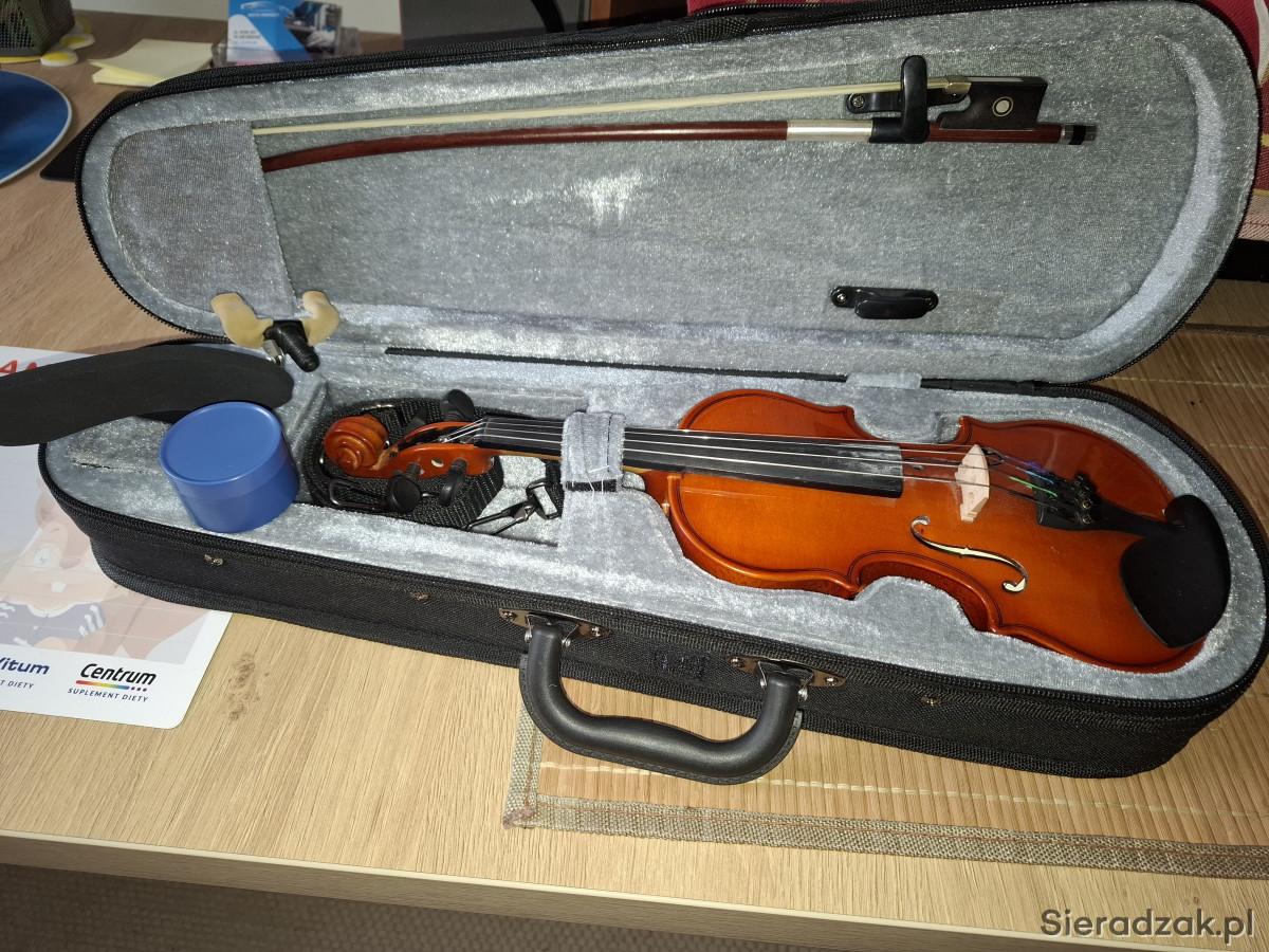 Do sprzedania używane przez jedno dziecko skrzypce 1/16 Ever Play ze smyczkiem, futerałem, kalofonią i żeberkiem. Nastrojone.