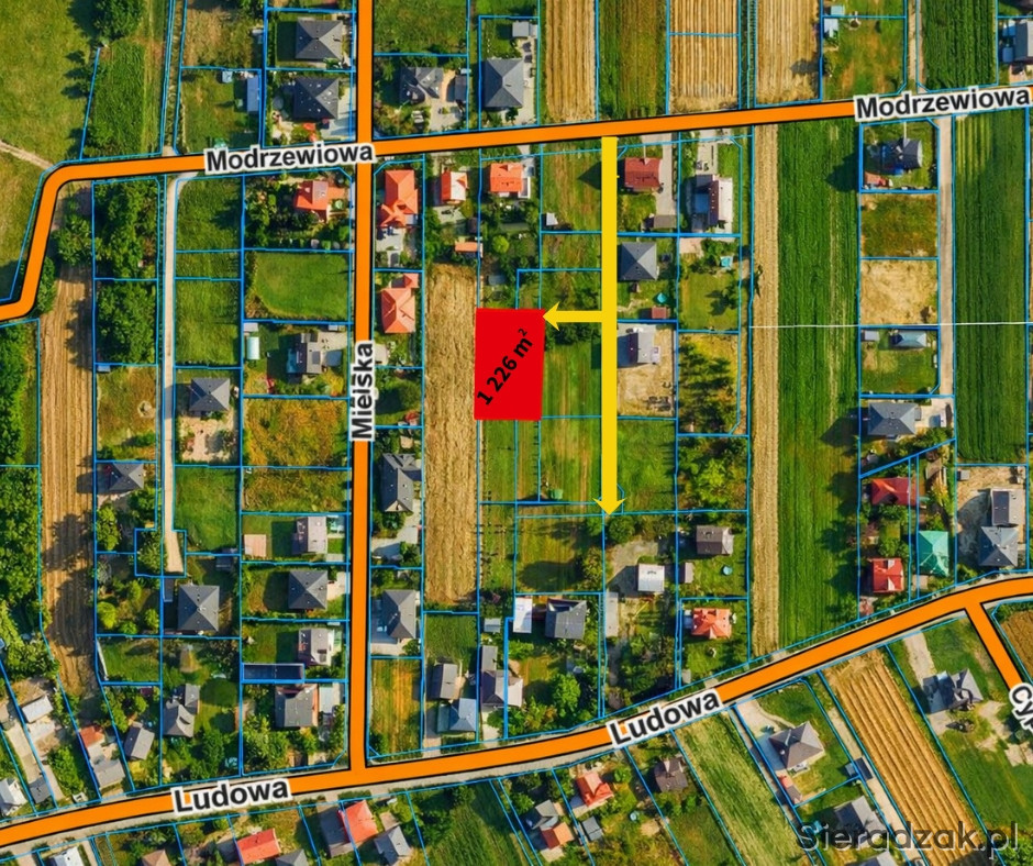 Działka położona jest pomiędzy ul. Ludową a ul. Modrzewiową w Sieradzu, w otoczeniu nowej zabudowy jednorodzinnej w układzie, który kupujący cenią najbardziej: druga linia zabudowy / działka w głębi – czyli mniej hałasu, mniej przypadkowego ruchu i zdecydowanie więcej prywatności.