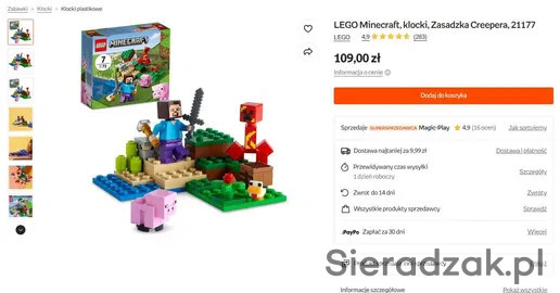 Witam, sprzedam zestaw Lego Minecraft. Cena pojedynczo nie podlega negocjacji, natomiast przy kupnie większej ilości zestawów przewiduję rabat. Zapraszam na inne moje oferty po zestawy LEGO Minecraft i LEGO Friends.
