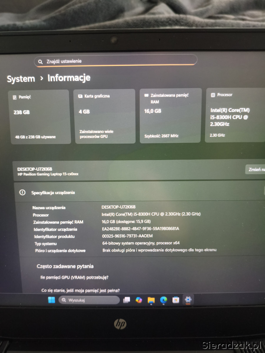 Na sprzedaż mam laptopa gamingowego do gier HP Pavilion Gaming Laptop ma szybki procesor Intel Core I5-8300H, grafikę NVIDIA GeForce GTX 1050 oraz 16gb pamięci RAM i dysk ssd 256gb m2 szybki. (możliwość wymiany dysku na większy 512 bądź 1tb u mnie oraz możliwość dołożenia ramu do 32gb).