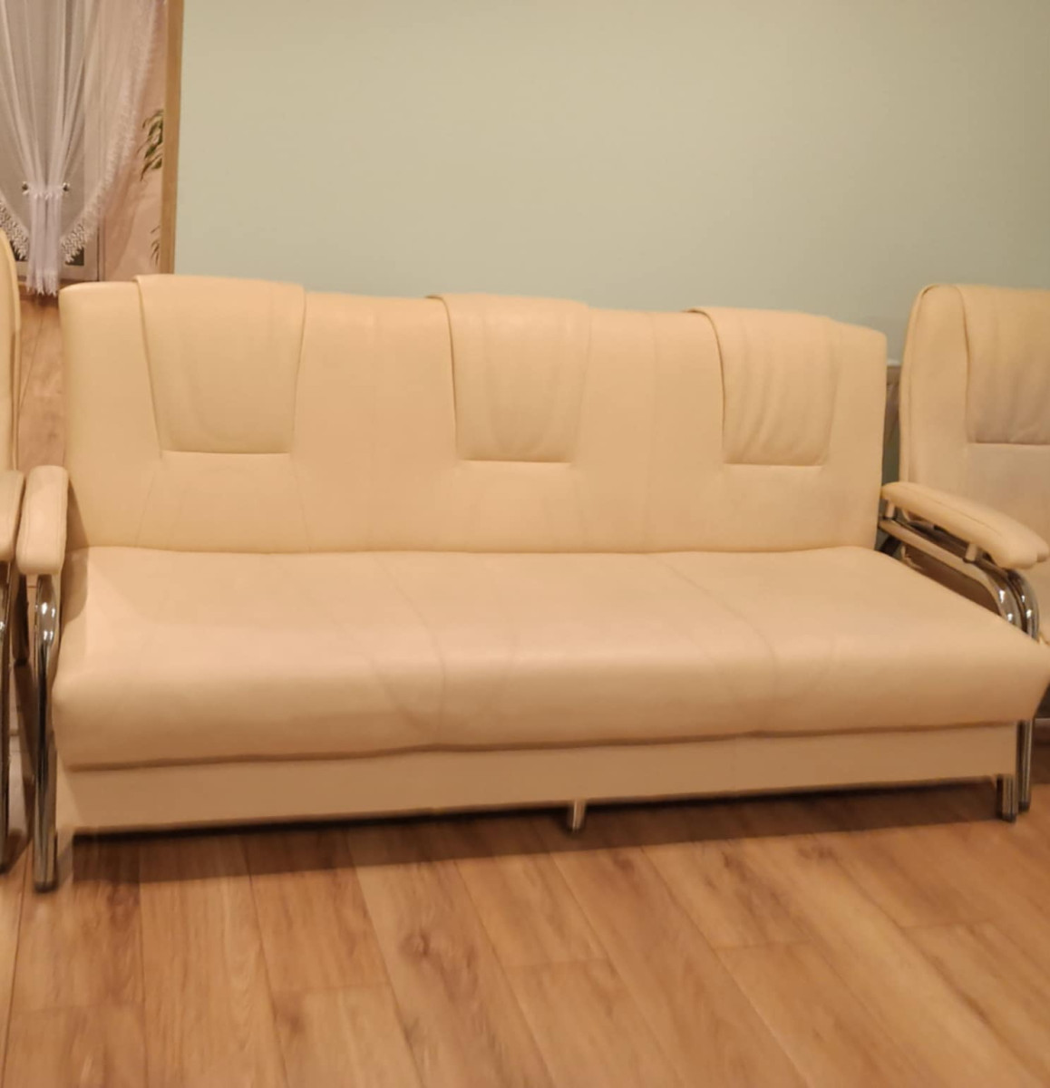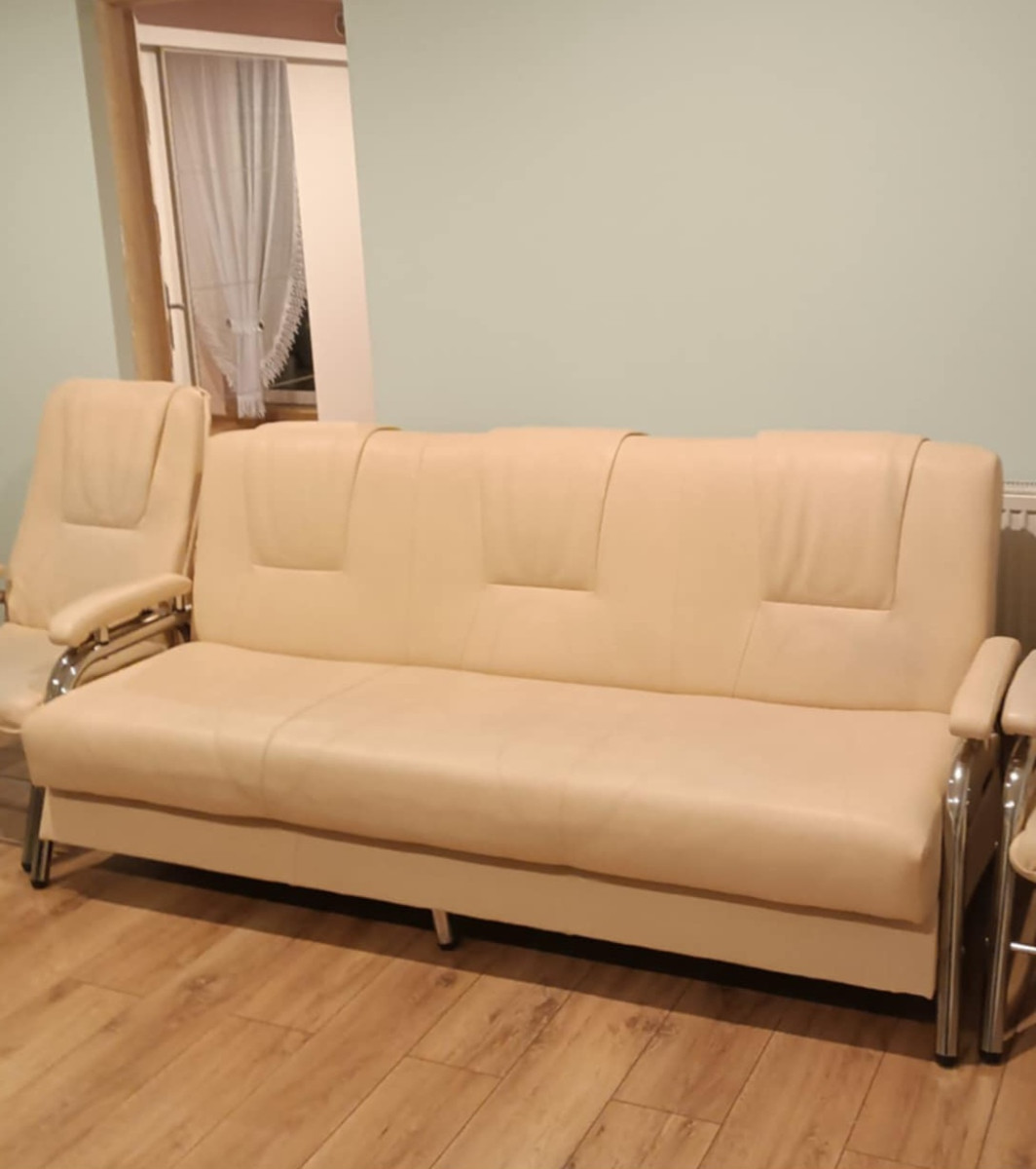 Kanapa rozkładana z ekoskóry, zadbana w bardzo dobrym stanie. Pięknie się prezentuje w salonie, wygodna.
