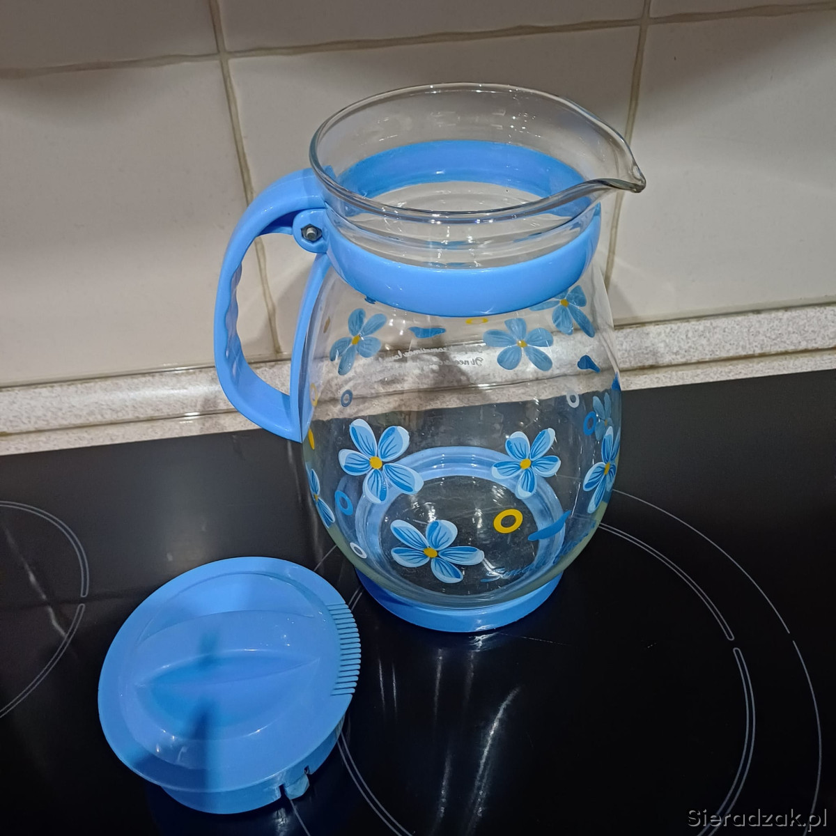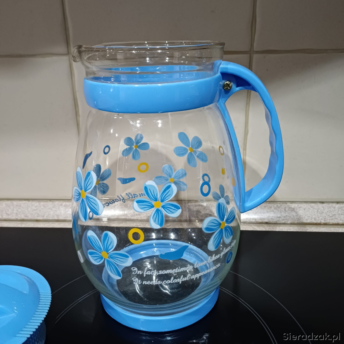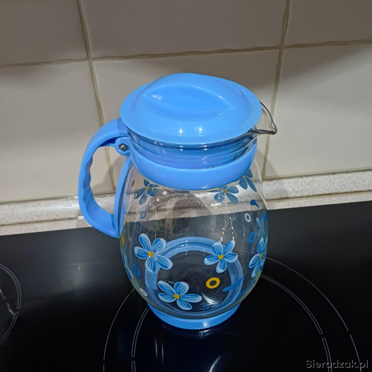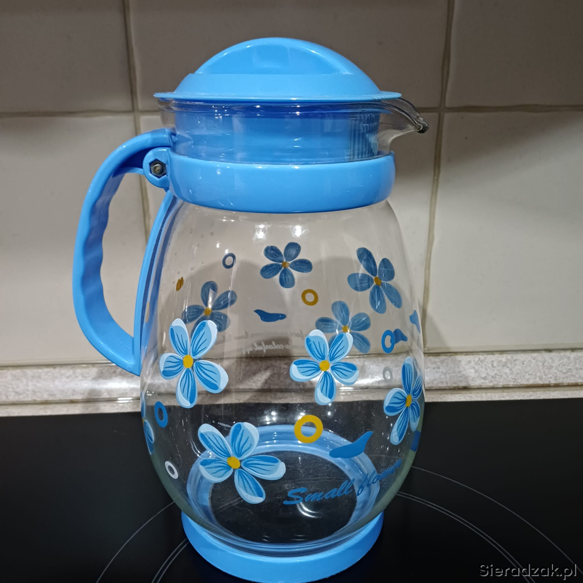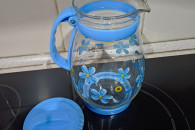 Szklany dzbanek z niebieskimi kwiatami,