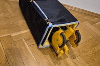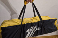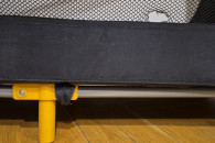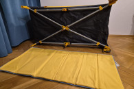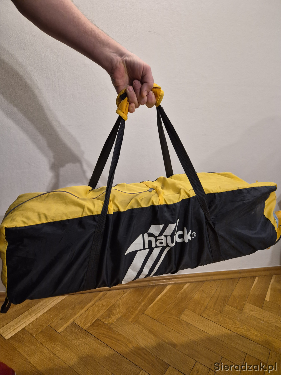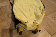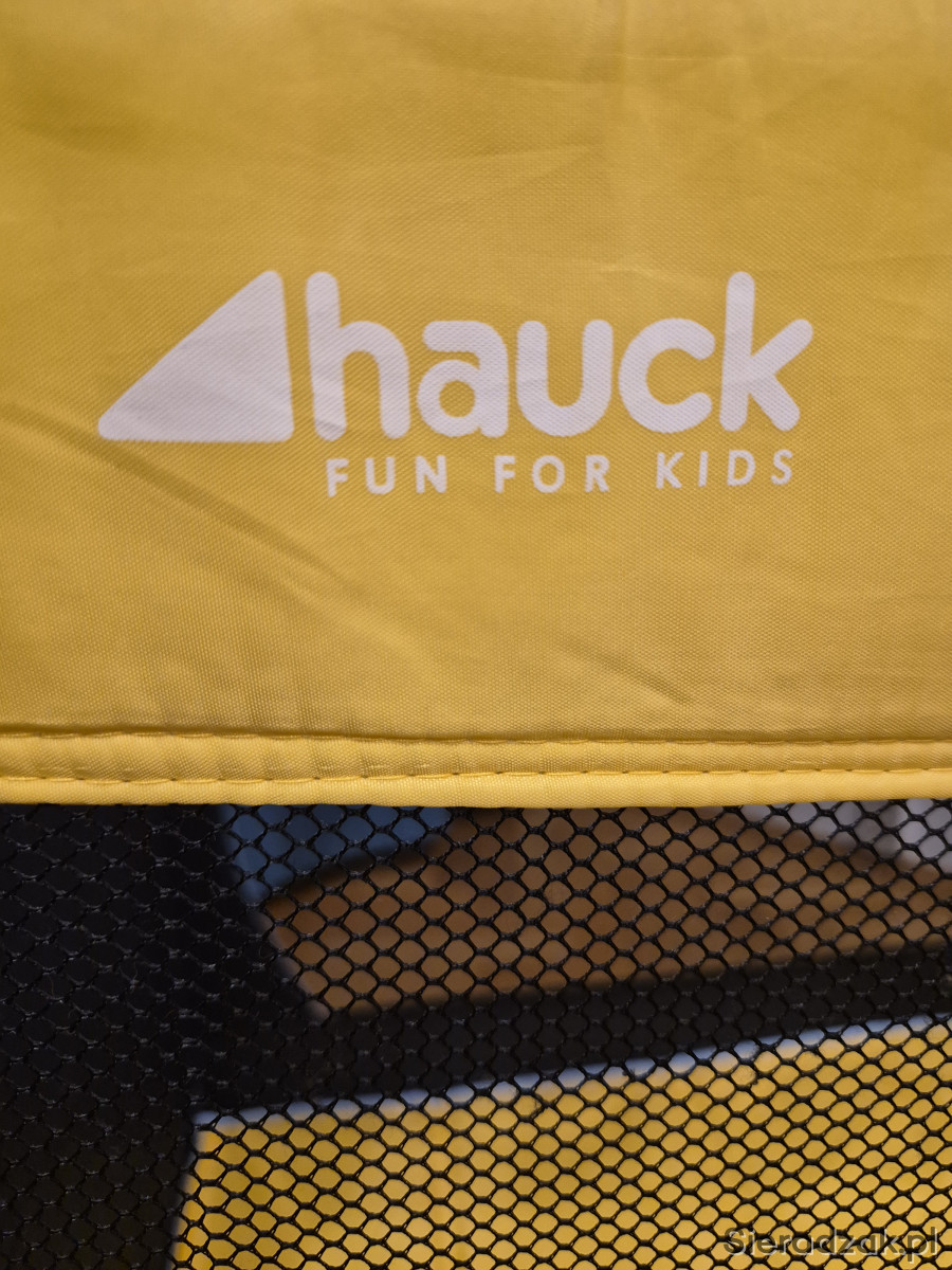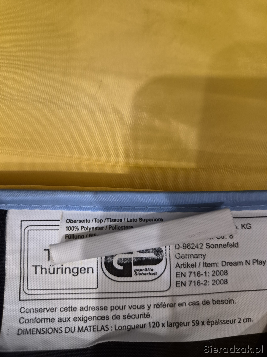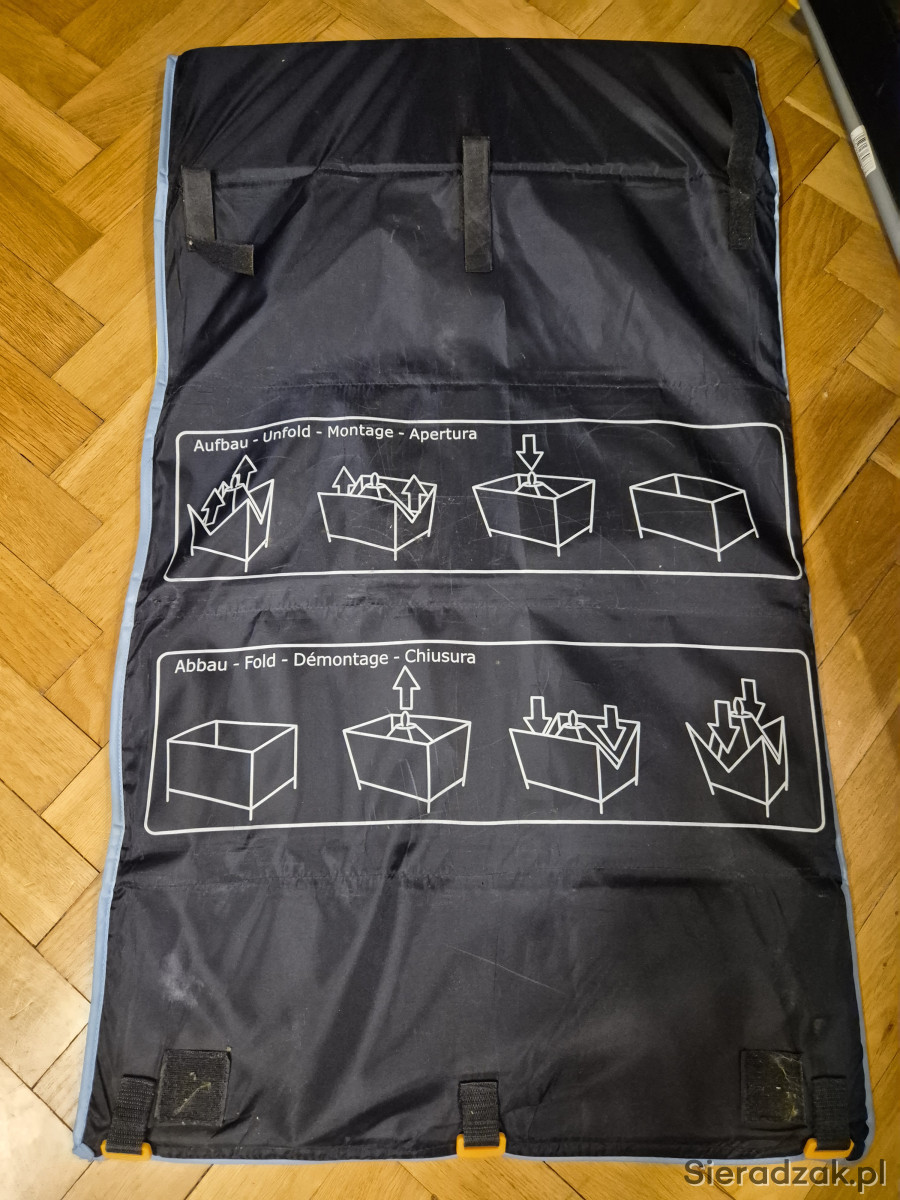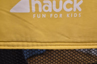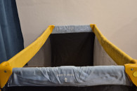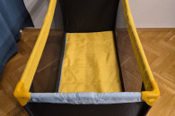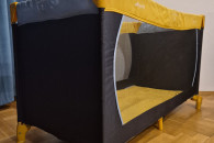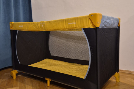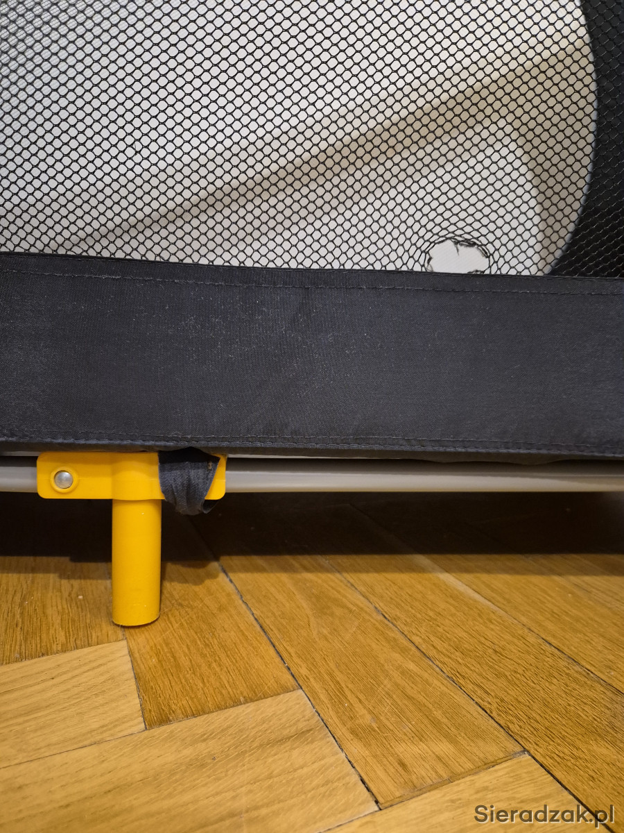 Stan bardzo dobry - używane, jedynie mała 1.5cm dziurka w siatce ochronnej i lekko naddarty pokrowiec/ochraniacz na złożone łóżeczko.