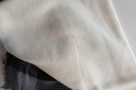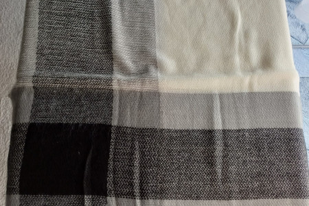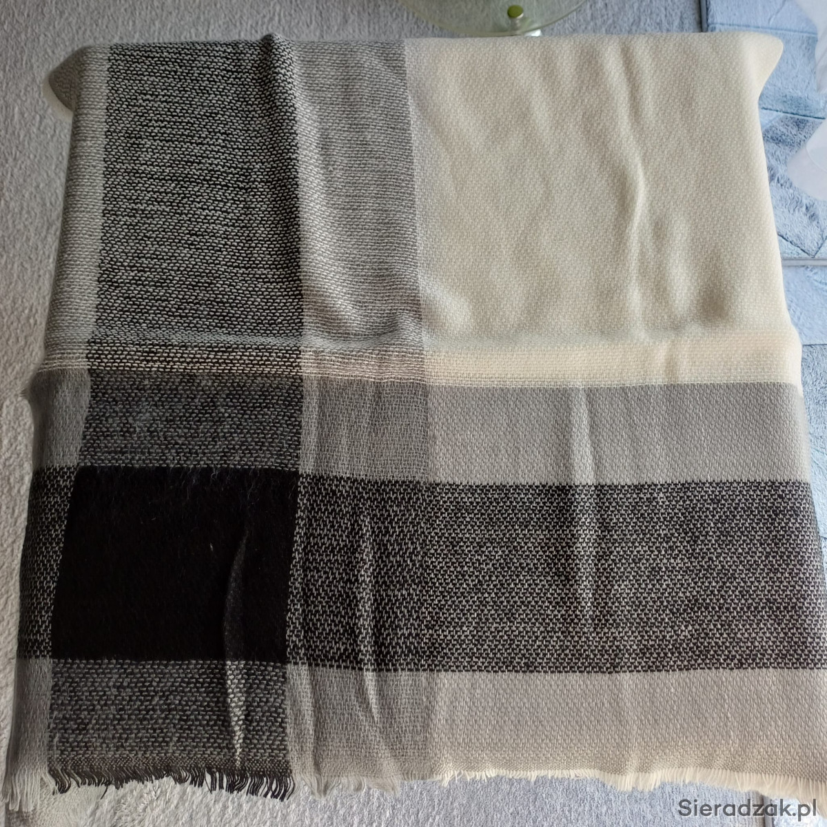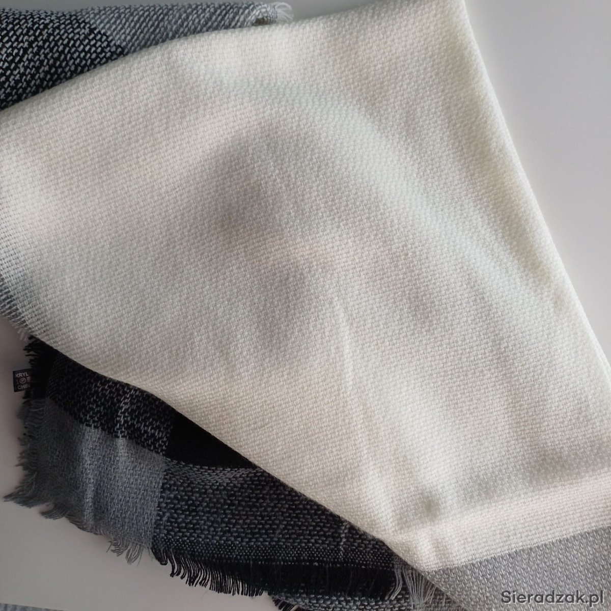Nowy szalik w kremowo-czarnym kolorze, o wymiarach 140x140 cm.