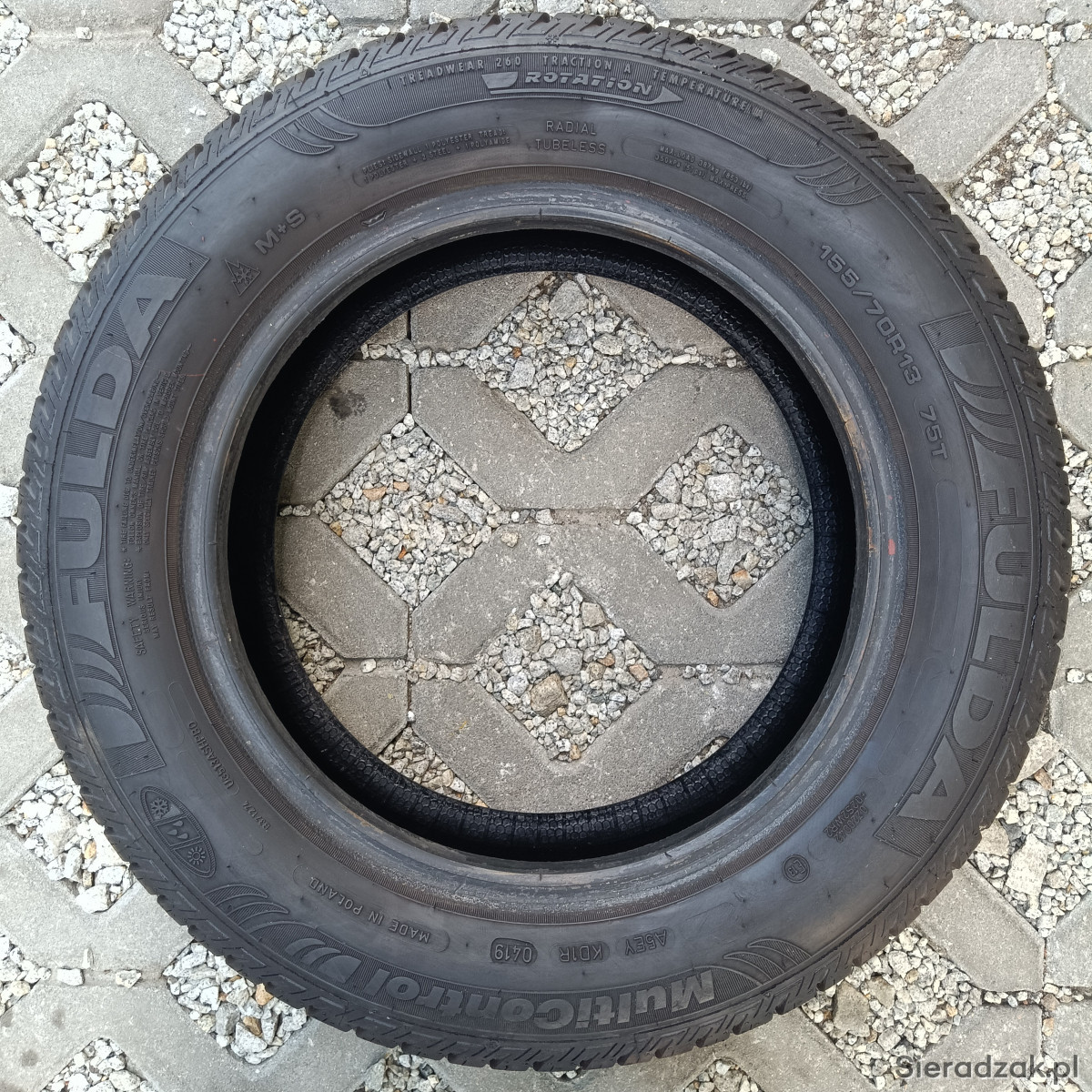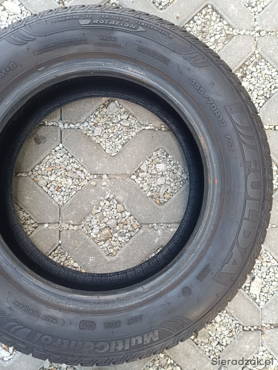 2x opony całoroczne wielosezonowe Fulda 155/70 R13 75T, DOT 0419, bieżnik 7,5mm. Opony w bardzo dobrym stanie, po niewielkim przebiegu jak na zdjęciach, sprawdzone ciśnieniowo.