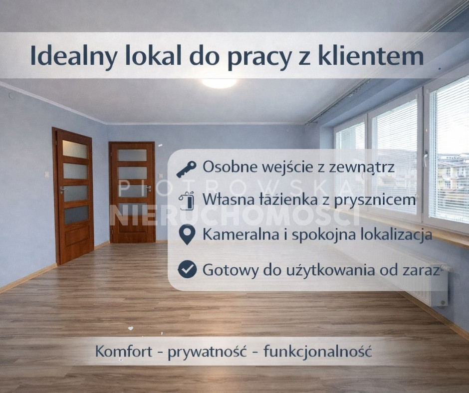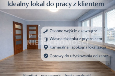 Pomieszczenie jest zadbane, gotowe do aranżacji według własnych potrzeb. Wielkość i układ pozwala na komfortową pracę z klientem, prowadzenie spotkań lub działalność indywidualną.