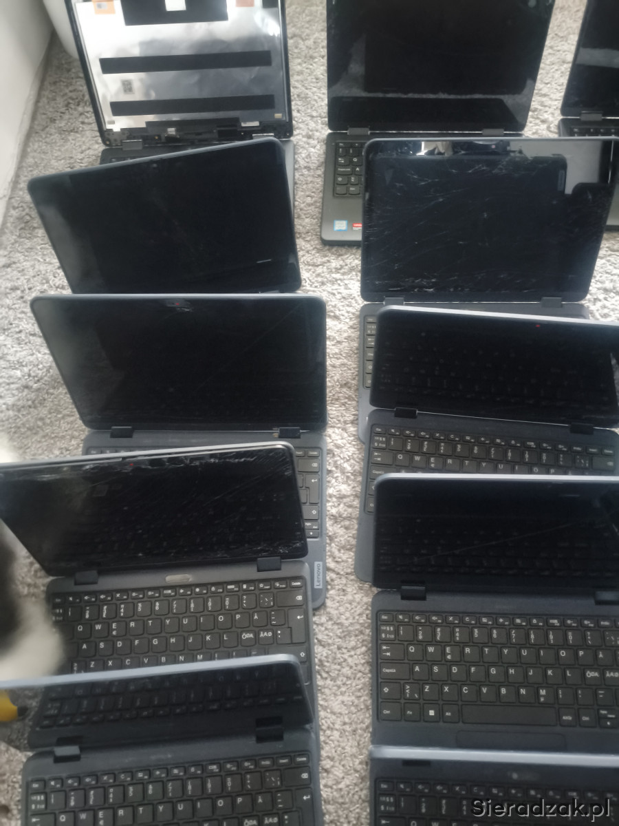Kazdy laptop ma uszkodzony/potłuczony Ekran, każdy nie ma dysku, jest jeden rysik do 500w, zasilaczy brak, wszystkie ładowane na USB c.