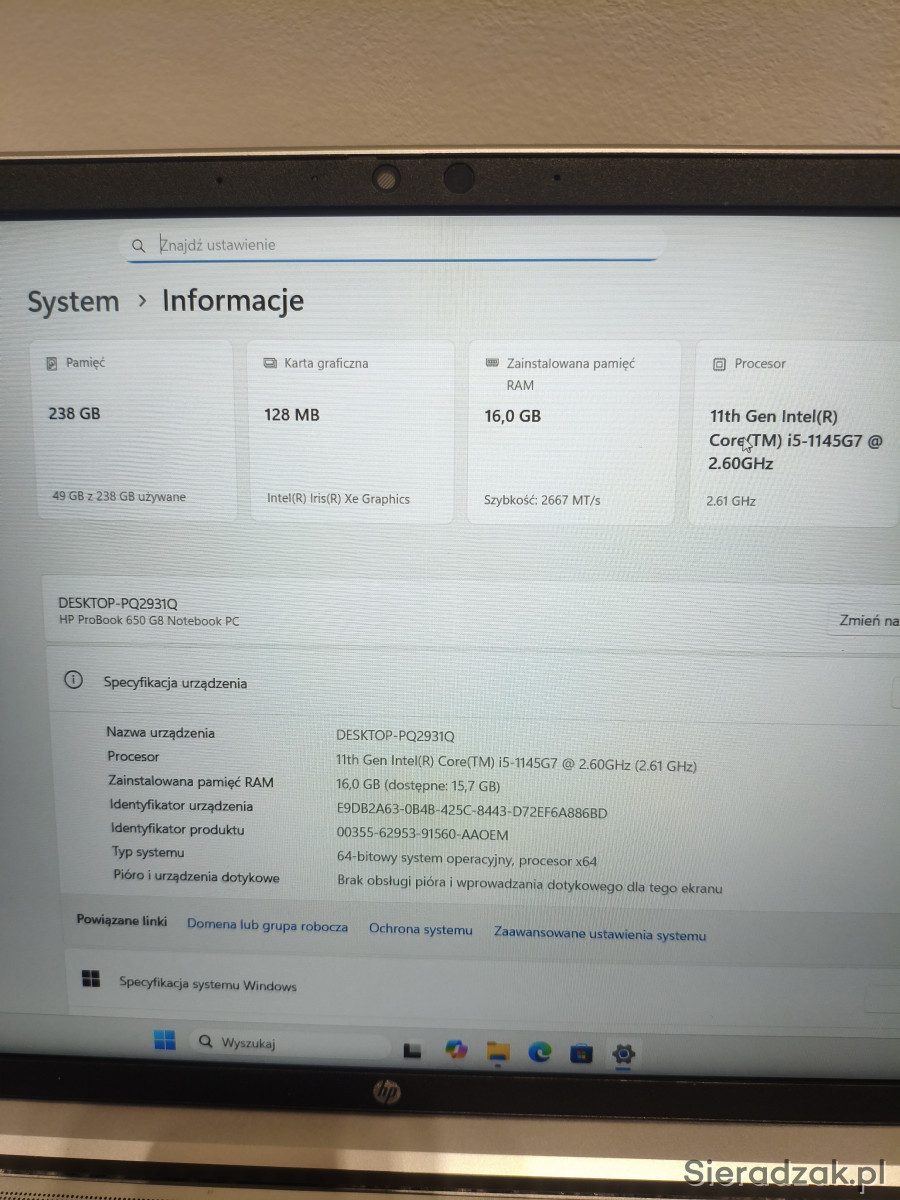 Na sprzedaż laptop premium, HP Probook 650 G8, jest to świeży oraz szybki sprzęt ponieważ posiada procesor i5-11 generacji, 16GB Ram DDR4 oraz 256GB dysk SSD M2 Nvme (jest możliwość dołożenia u mnie pamięci ram do 32gb jak i wymiana dysku na 512gb bądź 1tb).