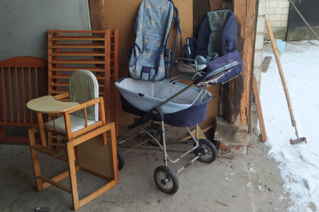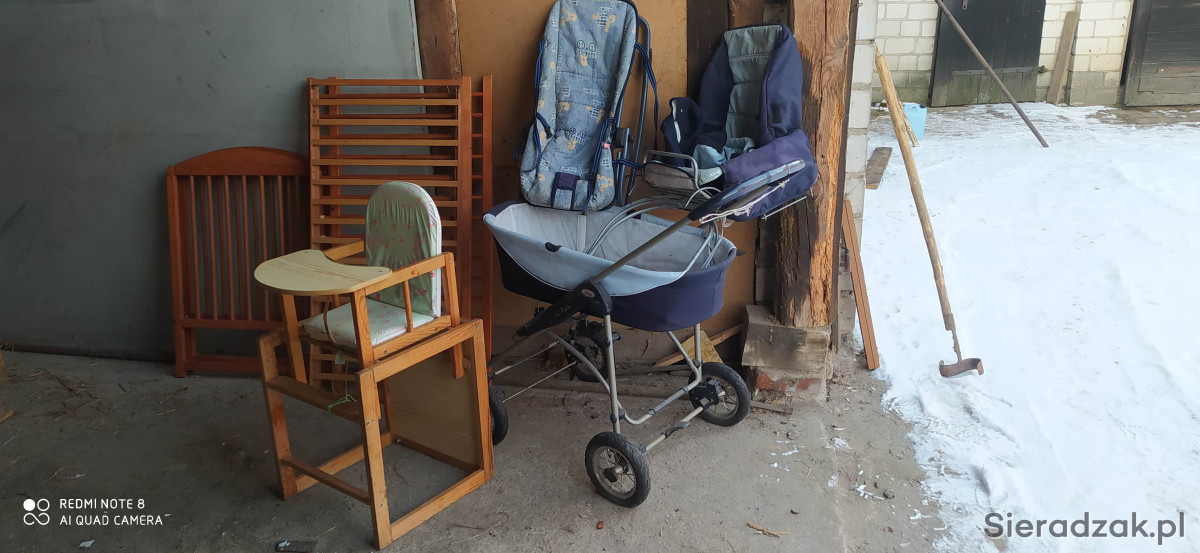 Łóżeczko,wózek duo (zwykły i spacerowy w jednym),krzesełeczko (dwie wysokości, z zabespieczeniem przed wypadnięciem)