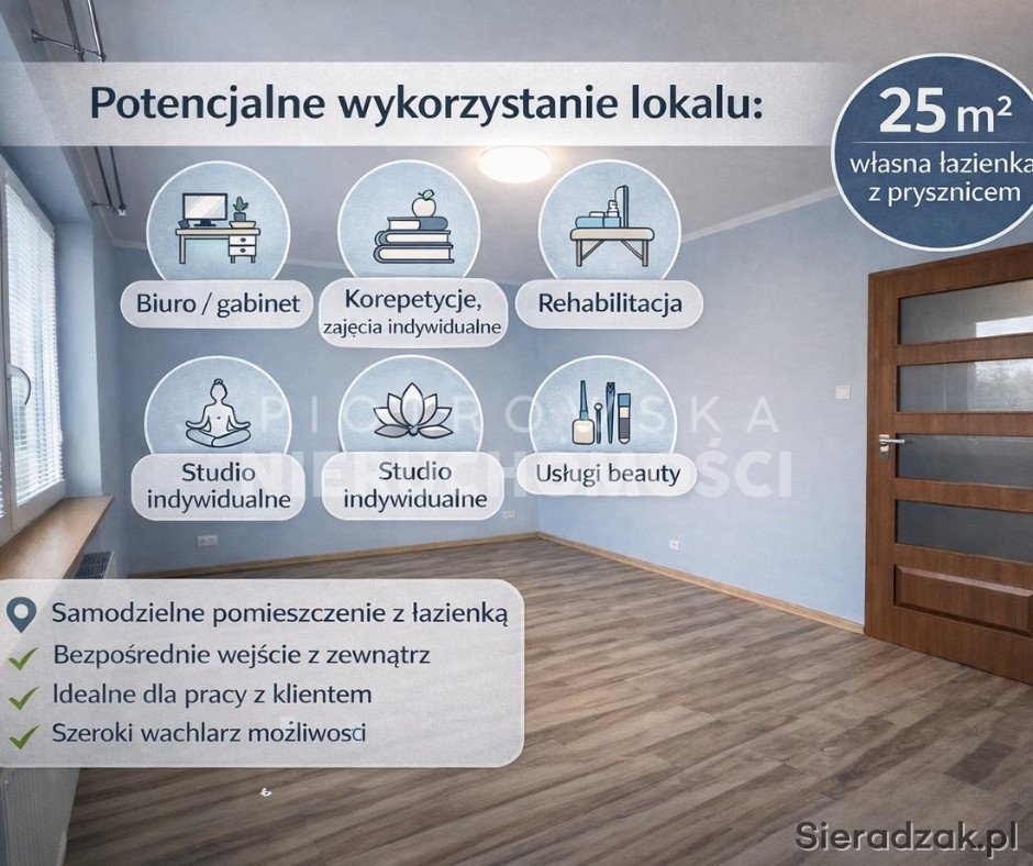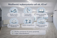 Przestrzeń idealnie sprawdzi się do prowadzenia działalności związanej z pracą z klientem, zajęciami grupowymi, rozwojem osobistym, ruchem lub terapią.
