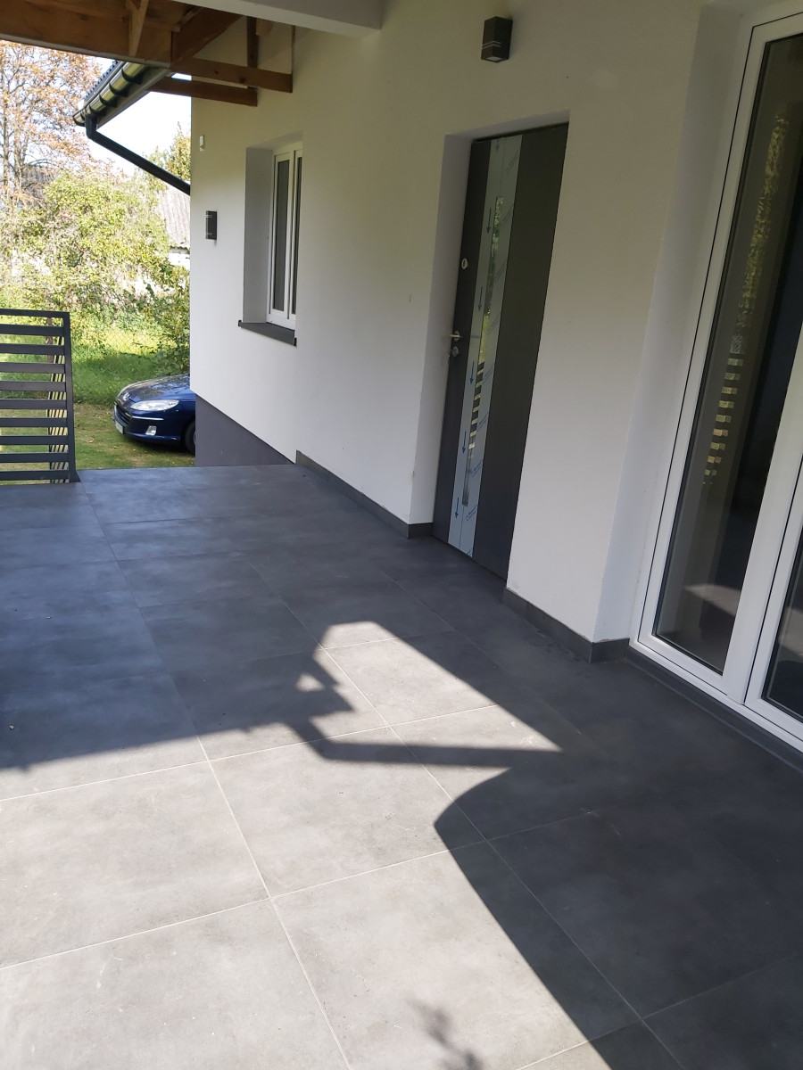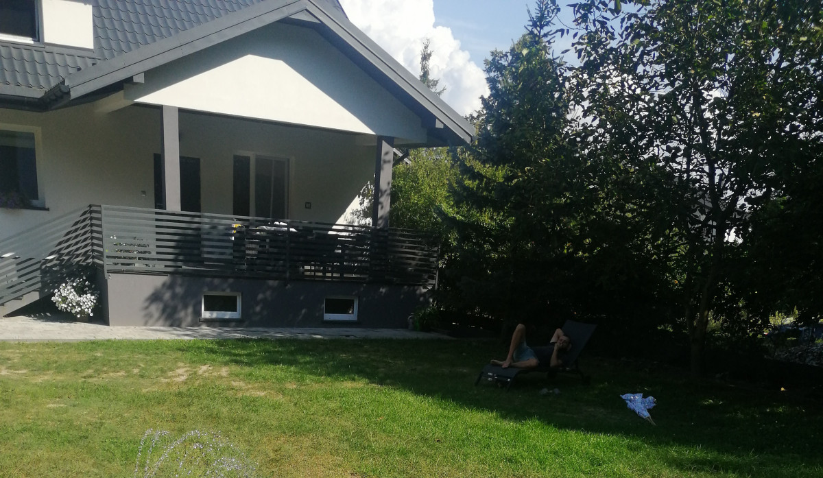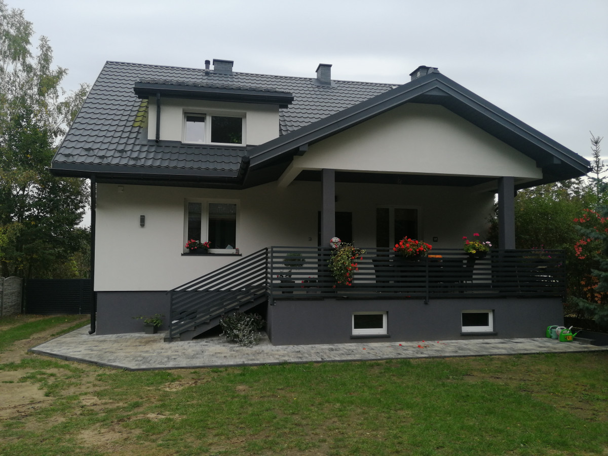 Przed domem znajduje się zadaszony taras z balustradami wykonanymi z ocynkowanej stali i pomalowanymi proszkowo.