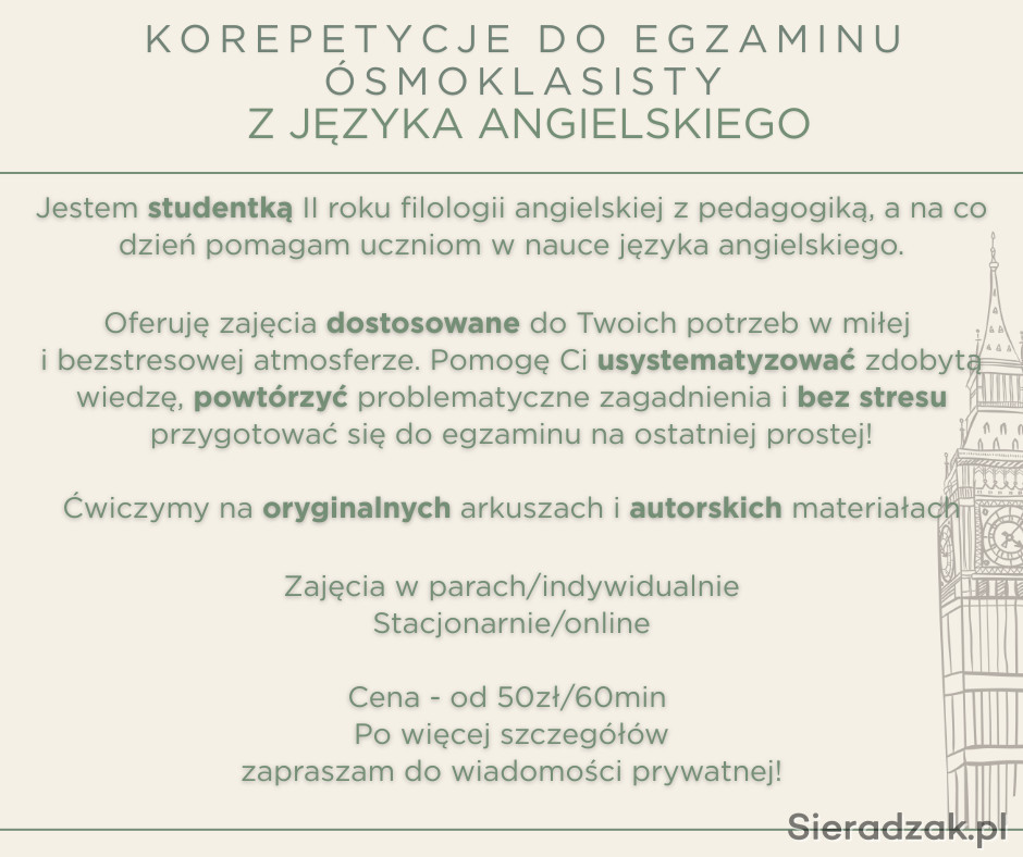 Jeśli szukasz korepetycji z języka angielskiego poświęconych przygotowaniom do nadchodzącego egzaminu ósmoklasisty to to ogłoszenie jest właśnie dla Ciebie!