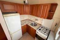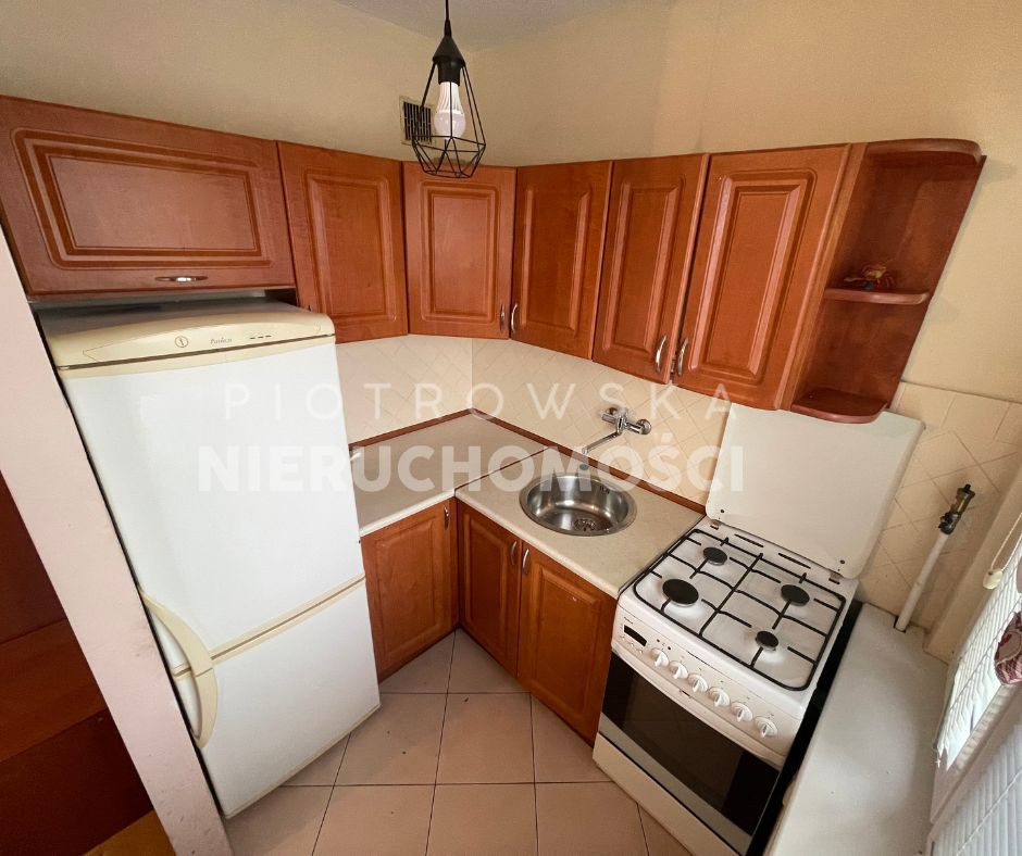 W aneksie kuchennym pozostają meble oraz sprzęt AGD: lodówko-zamrażarka oraz kuchenka gazowa z piekarnikiem.