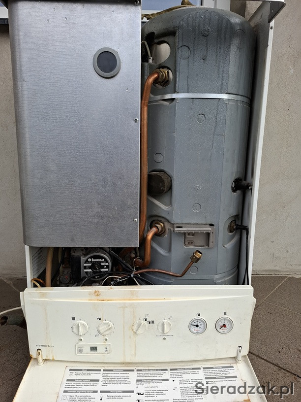 Kocioł gazowy, kondensacyjny, dwufunkcyjny (CO + woda ciepła). Producent Immergas, model Victrix Zeus 20. Moc 23,5 kW, rocznik 2005. Świeżo po demontażu, przyczyna nieznaczny wyciek, poza tym wszystkie układy sprawne. Odbiór osobisty.