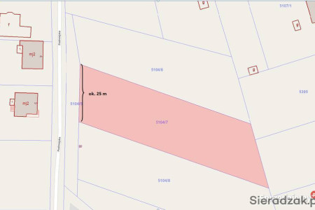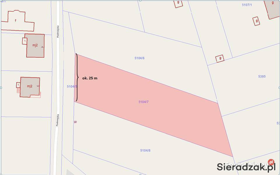 Działka budowlana o numerze geodezyjnym 5104/7, o powierzchni 2029 m2, położona w Sieradzu, bezpośrednio przy ul. Podmiejskiej. Kształt działki zbliżony do prostokąta. Granicą zachodnią przylega do drogi o nawierzchni utwardzonej asfaltem. Sąsiedztwo działki stanowi zabudowa mieszkaniowa jednorodzinna. Okolica cicha, spokojna. Idealne miejsce do zamieszkania dla rodziny z dziećmi.