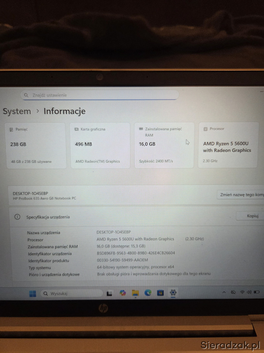 Na sprzedaż laptop premium, HP Probook 835 Aero G8, jest to świeży oraz szybki sprzęt ponieważ posiada procesor Ryzen 5 5600, 16GB Ram DDR4 oraz 256GB dysk SSD M2 Nvme (jest możliwość dołożenia u mnie pamięci ram do 32gb jak i wymiana dysku na 512gb bądź 1tb).