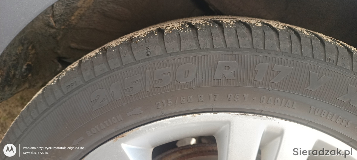 Komplet kół aluminiowych r17 z oponami letnim 215/50/17 bieżnik ok 4-5 mm felgi noszą normalne ślady użytkowania proste gotowe do montażu więcej informacji na telefon 512_572_725 nie wysyłam za pobraniem preferowany odbiór osobisty lub zamówienie kuriera na własny rachunek do obejrzenia w Sieradzu