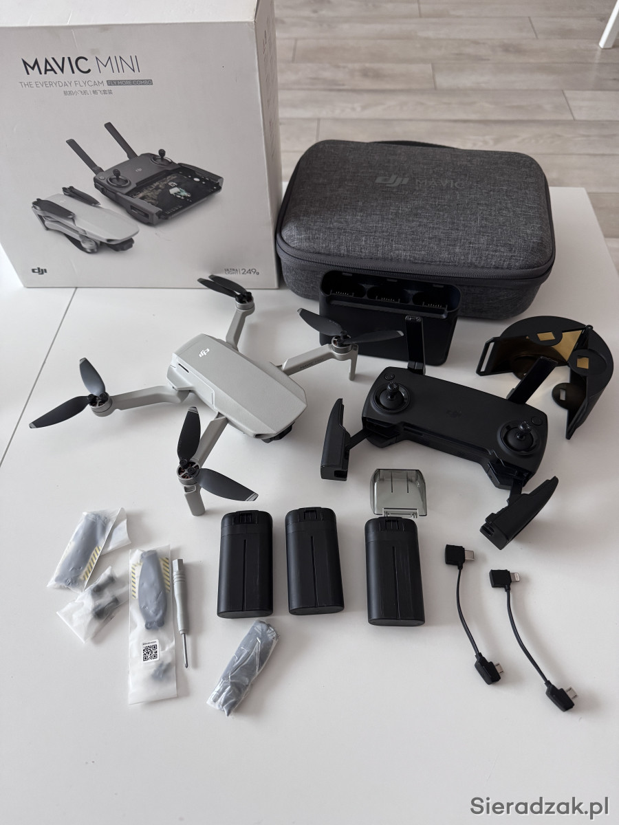 Dron Dji Mavic Mini 1 w zestawie z trzema bateriami, wzmacniaczem i etui. Stan urządzenia jest świetny. Waga drona wynosi jedynie 249g. Idealny wybór dla miłośników lotów!