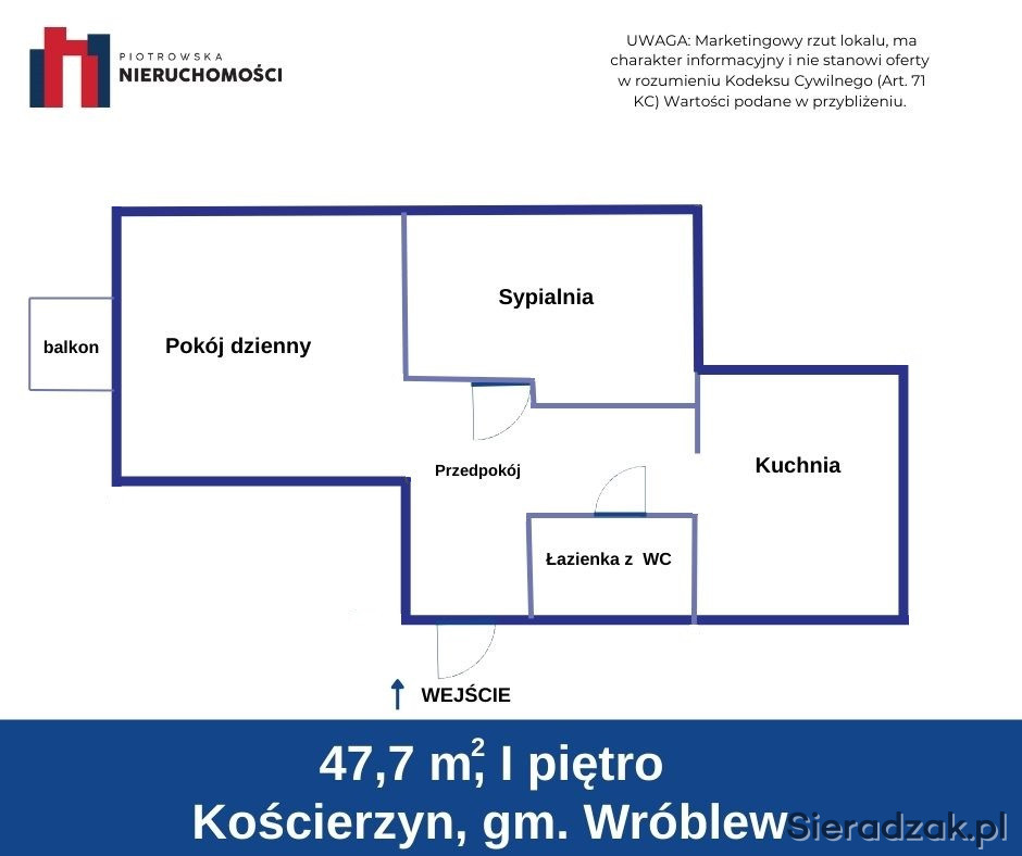 Na sprzedaż: 2-pokojowe mieszkanie z balkonem – Kościerzyn, gm. Wróblew | 47,7 m² | I piętro