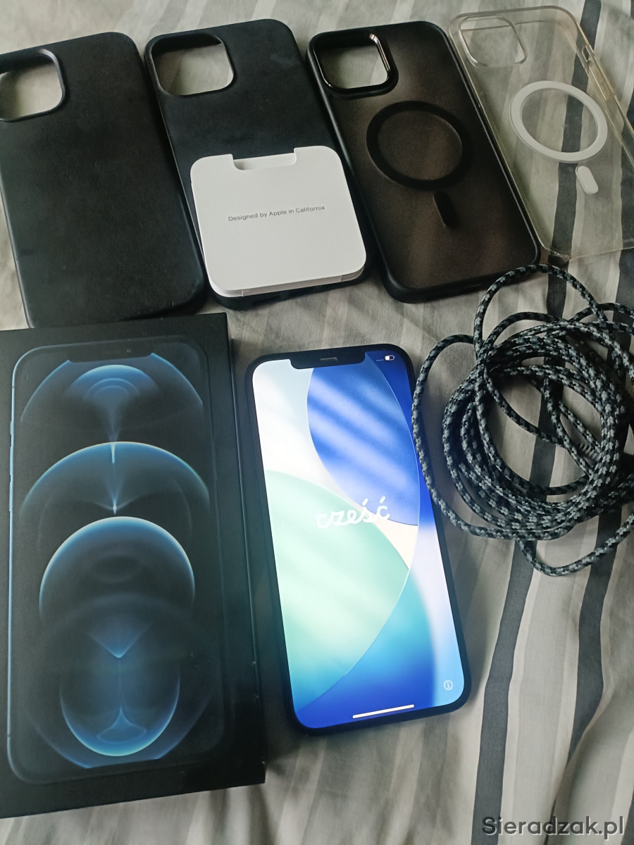 Sprzedam IPhone 12 Pro Max Pacific Blue 128GB w stanie idealnym bez jakichkolwiek wad, oczywiście w pełni sprawny.Na telefonie naklejona folia ochronna na ekran więc nie ma żadnej ryski.Tyl oraz ramka telefonu również stan idealny.W komplecie pudełko, dokumenty,kabel USB,4sztuki etui które są widoczne na zdjęciu, kluczyk do karty.Bateria 77%.Telefon bez blokad, zresetowany do zera pod nowego właściciela.
