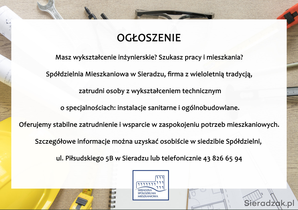 Spółdzielnia Mieszkaniowa w Sieradzu, firma z wieloletnią tradycją, zatrudni osoby z wykształceniem technicznym o specjalnościach: instalacje sanitarne i ogólnobudowlane. Oferujemy stabilne zatrudnienie i wsparcie w zaspokojeniu potrzeb mieszkaniowych.