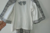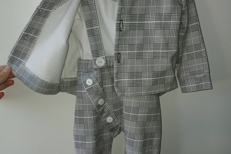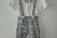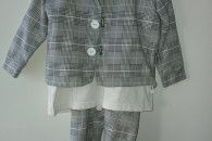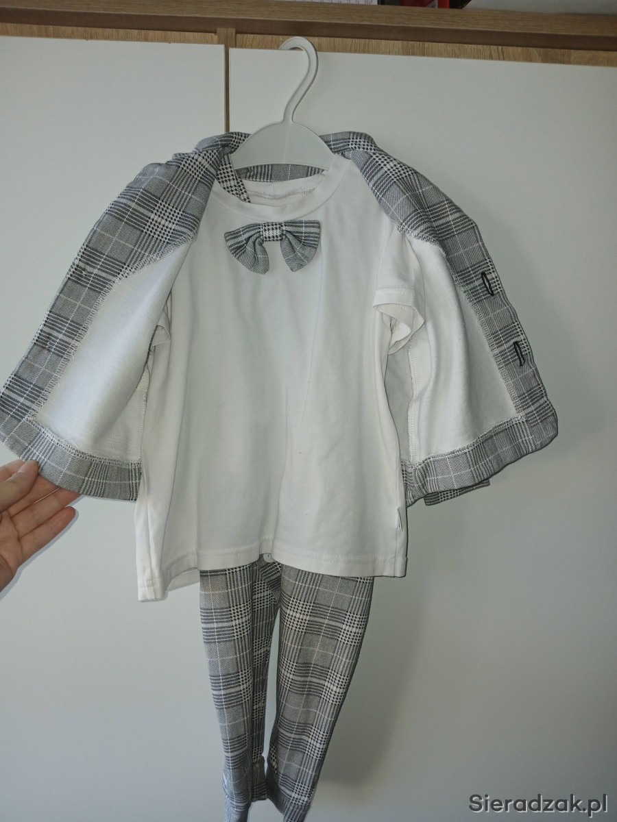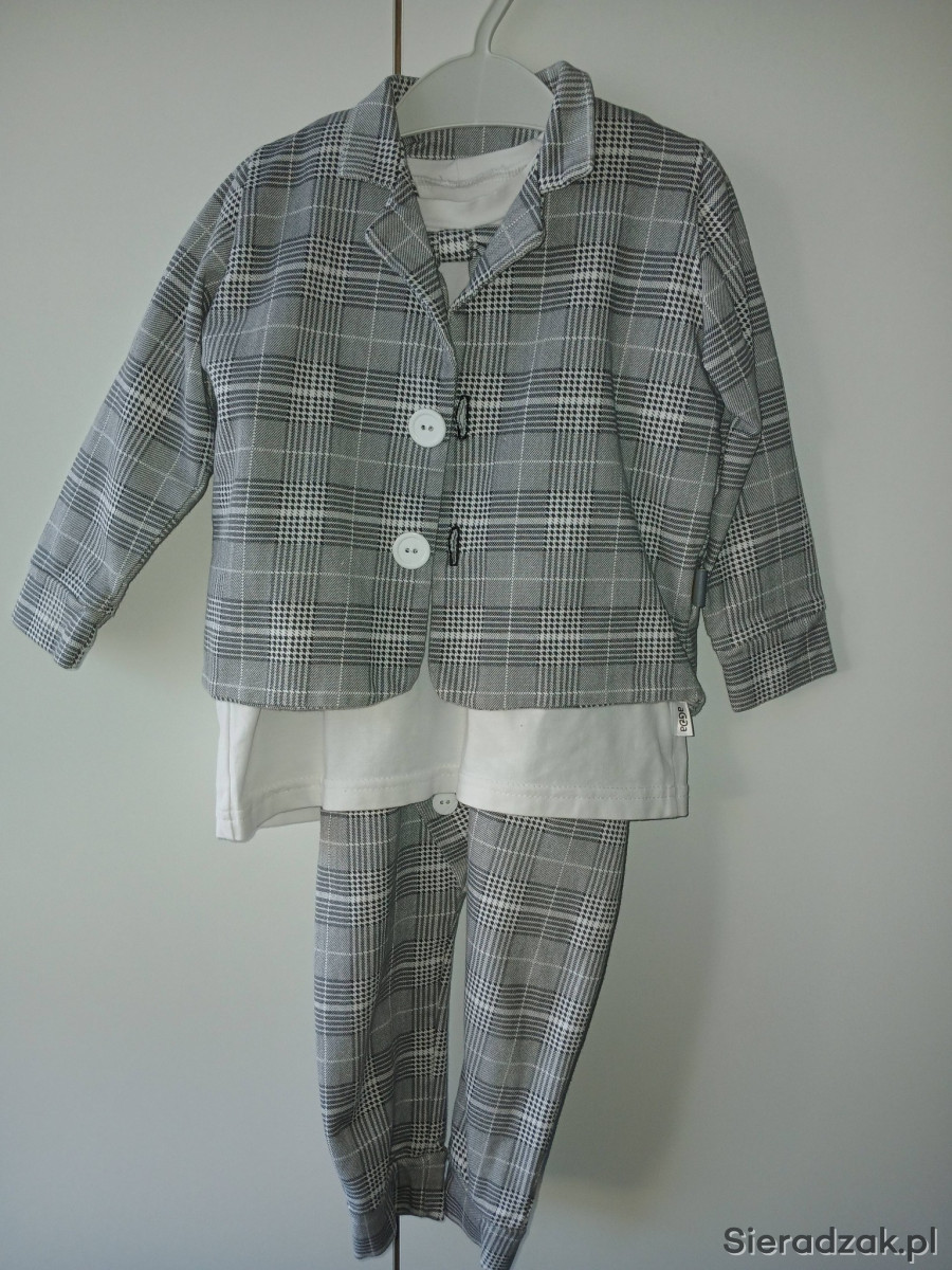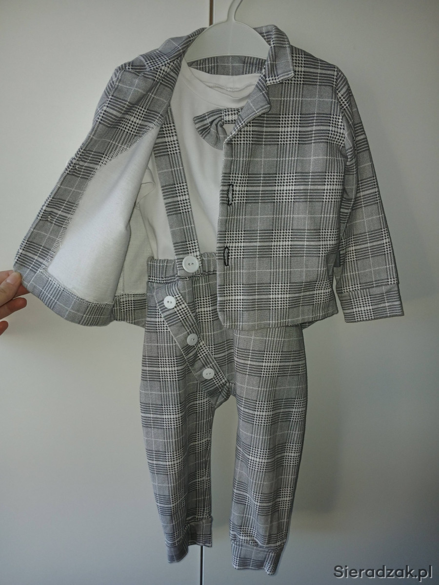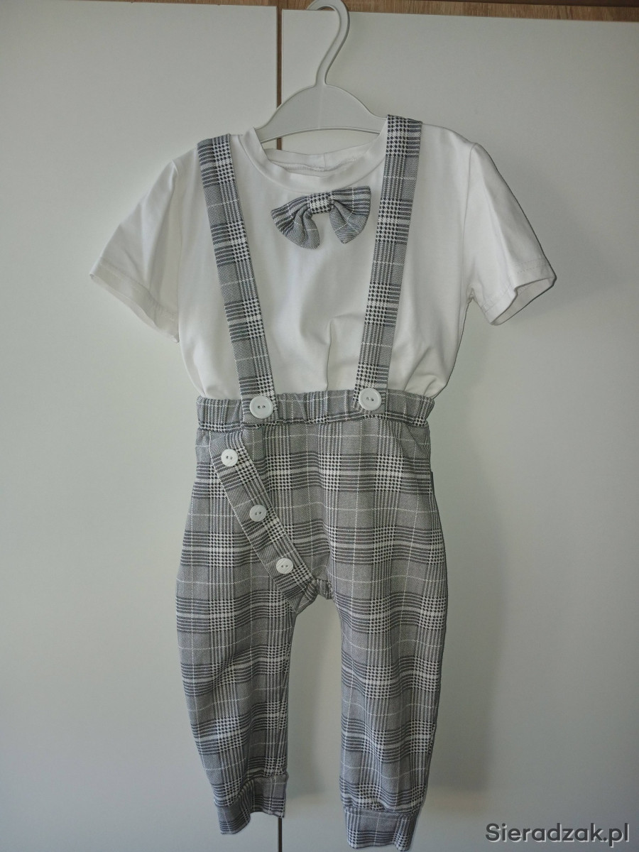 Sprzedam bardzo dobrej jakości garniturek użyty raz rozm na ok 2 latka . w zestawie bluzka z wszytą muszką, spodnie na szelkach oraz marynarka rozpinana. Stan bardzo dobry cena 140zł .