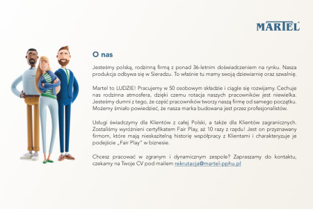 Jeśli funkcjonowanie w zespole nie jest Ci obce to ta praca jest właśnie dla Ciebie. Jesteśmy dużą firmą rodzinną, której tradycje sięgają początku lat 90. Nasz zakład przeszedł szereg reform, które doprowadziły nas do miejsca, gdzie możemy poszczycić się silną i stabilną pozycją na rynku.