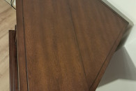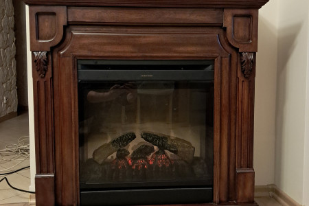 Narożny kominek elektryczny w ciemnobrązowej drewnianej obudowie. Posiada ozdobne elementy wykończeniowe i wbudowany panel sterowania. Idealny do przytulnego wnętrza. Można postawić go przy ścianie lub przy zastosowaniu dodatkowej zabudowy, w rogu pokoju.