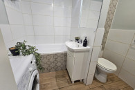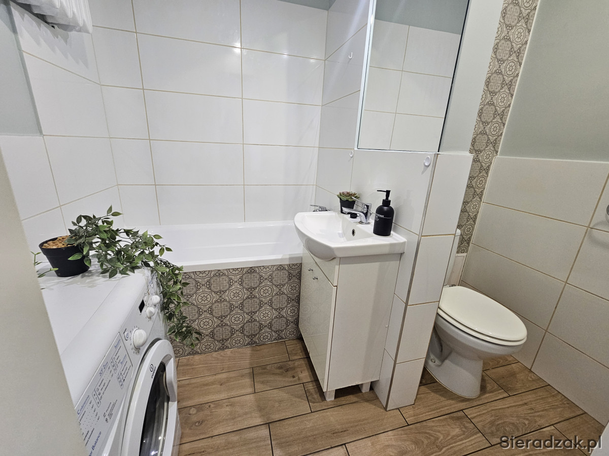 dużego pokoju z balkonem ok.25m², łazienki wraz z WC, przedpokoju oraz z w pełni wyposażonej i umeblowanej kuchni.