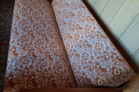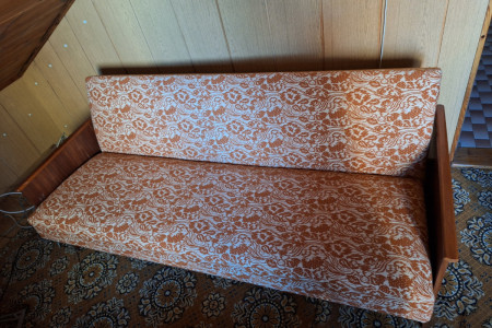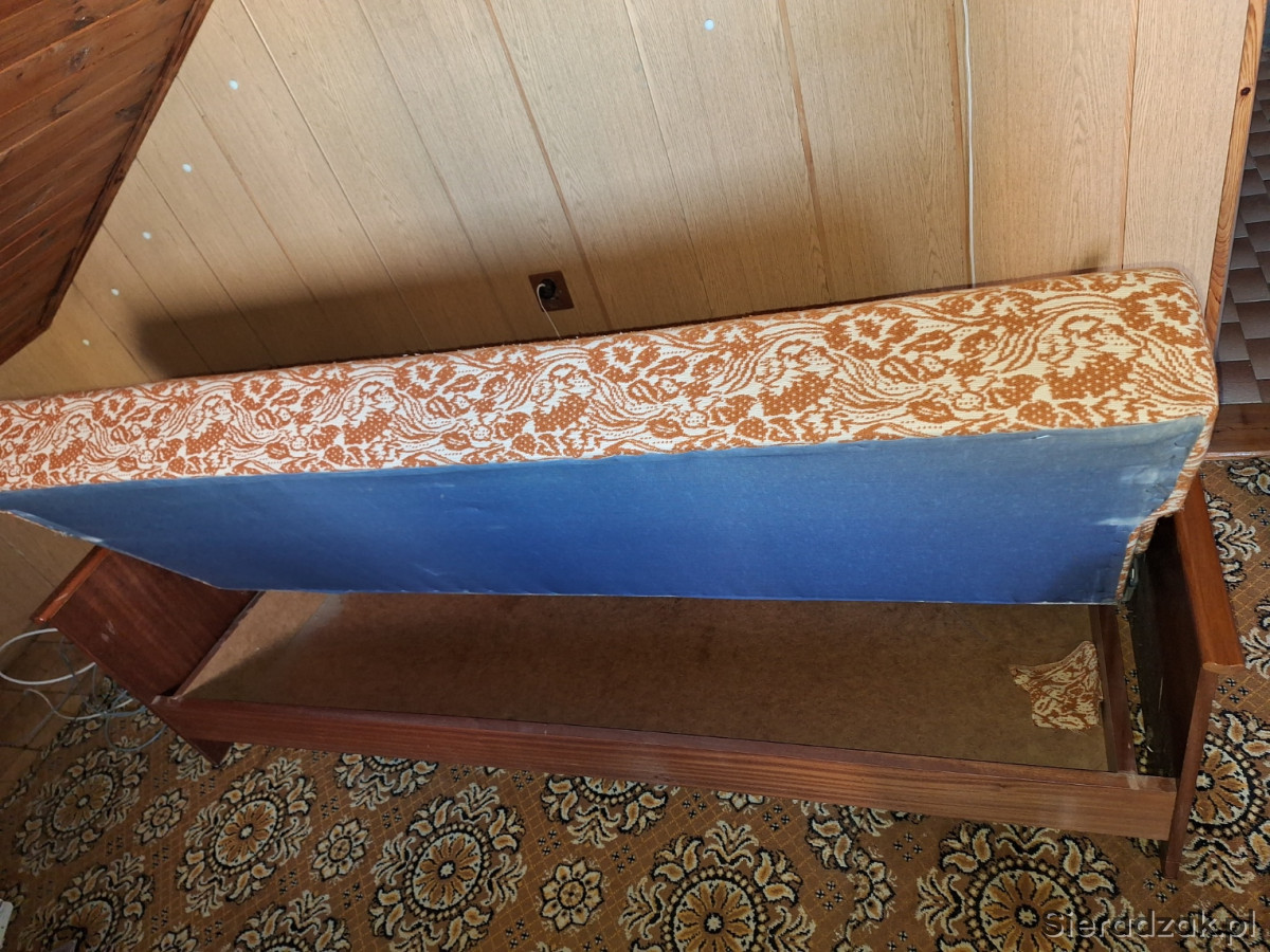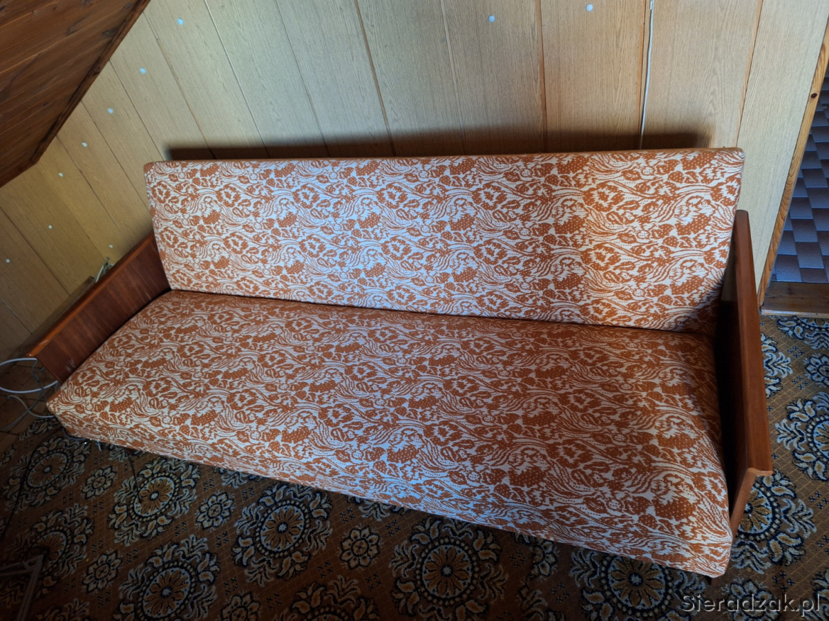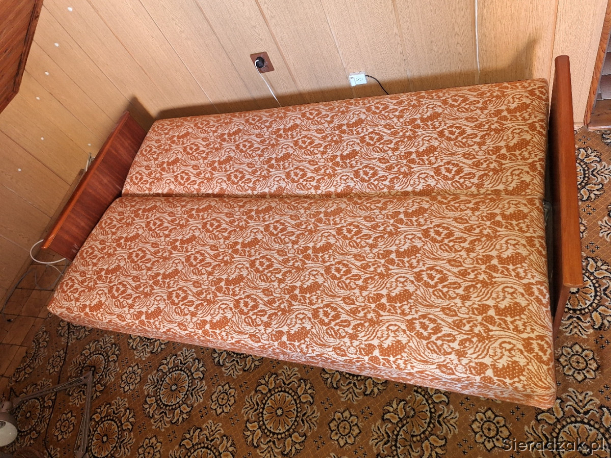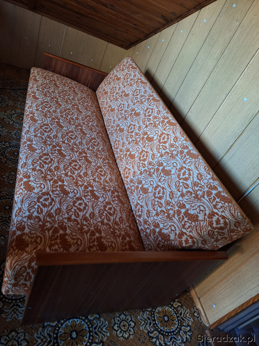 Wygodna sofa rozkładana z pojemnym schowkiem. Mebel w dobrym stanie, z charakterystycznym wzorem. Idealna do małego mieszkania lub na działkę. Praktyczne rozwiązanie, które pozwoli na wygodne spanie gości.