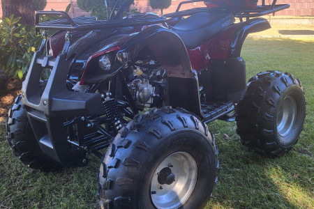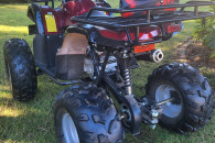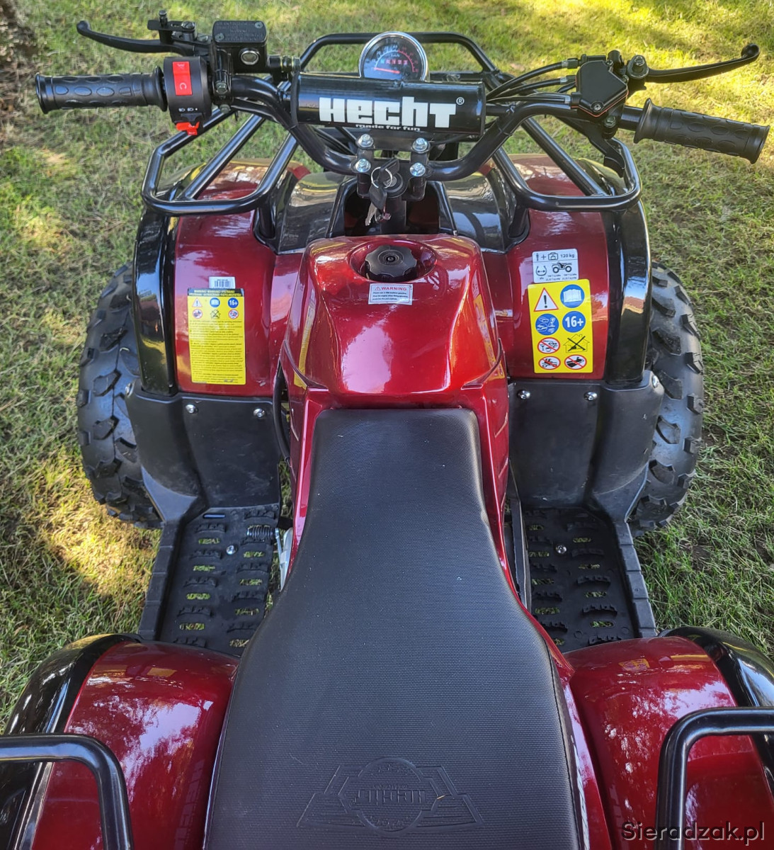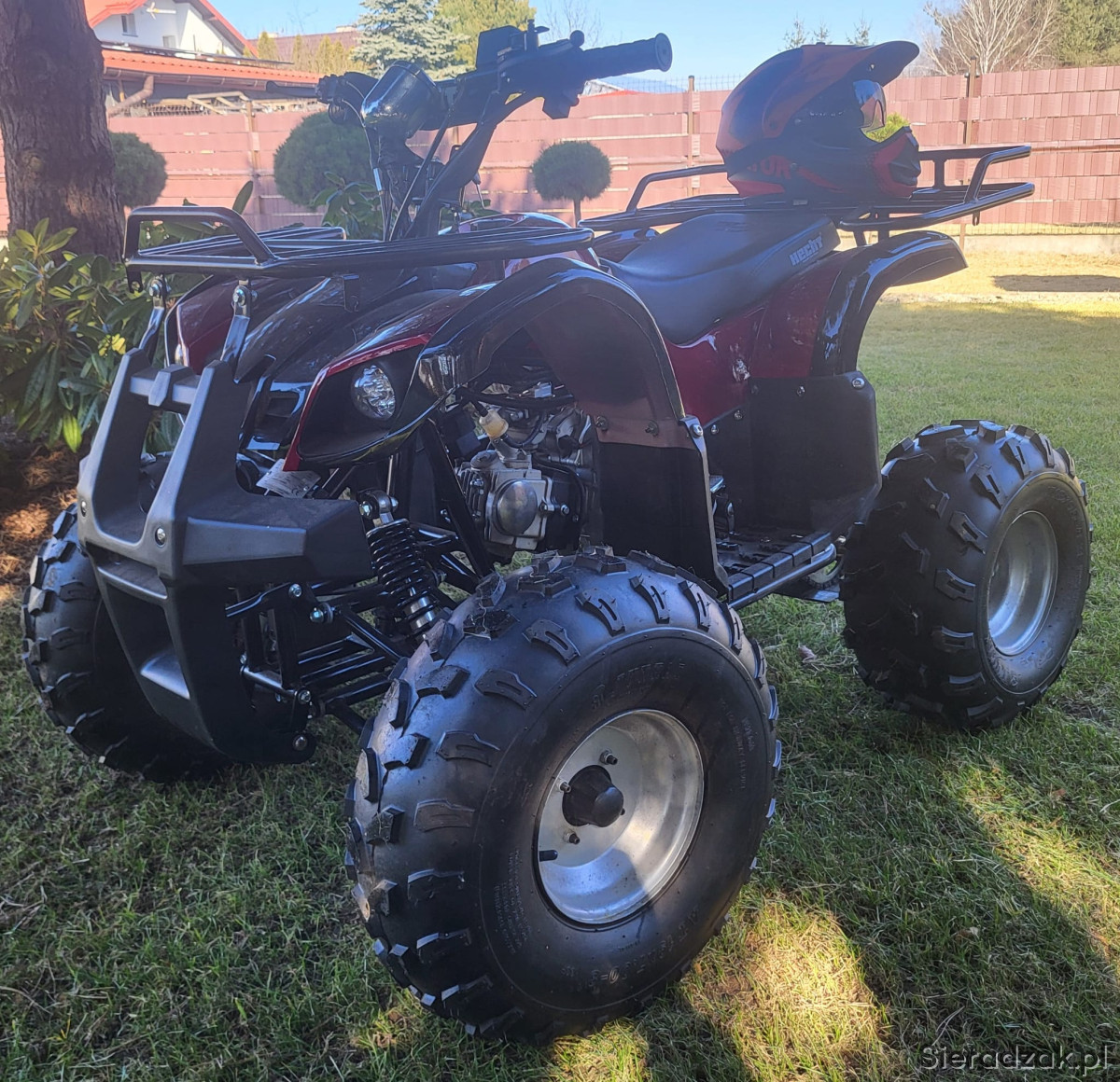 Quad z czterosuwowym silnikiem benzynowym o poj. 125cm3. Moc 8,1 km(6kW) prędkość maks. 50km/h. Nośność 120kg. Wymiary dł x szer x wys. 148x108x102 cm. Stan bardzo dobry. Kupiony w 2022 r. Mało użytkowany!