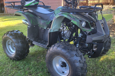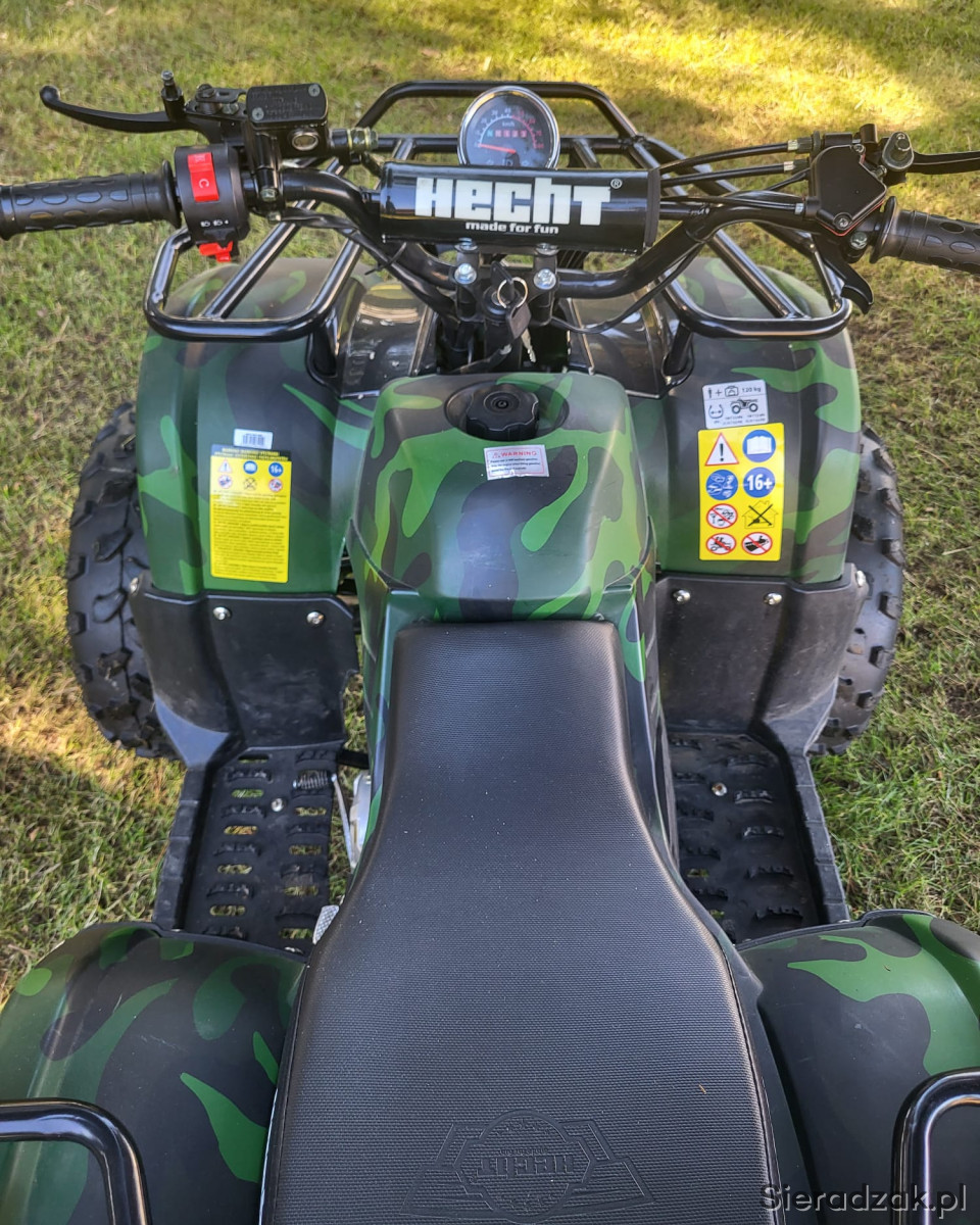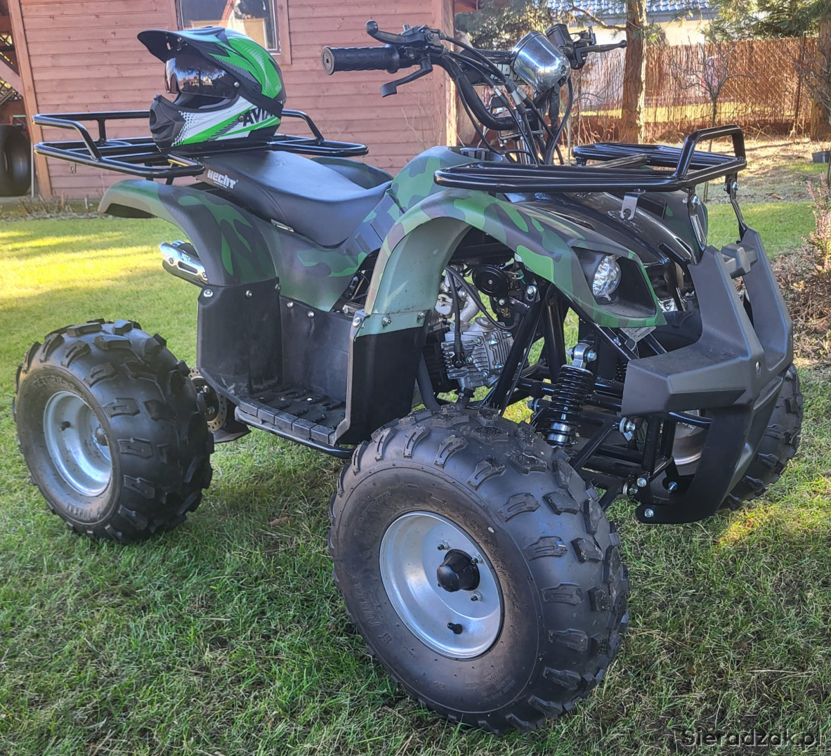 Quad z czterosuwowym silnikiem benzynowym o poj. 125cm3. Moc 8,1 km(6kW) prędkość maks. 50km/h. Nośność 120kg. Wymiary dł x szer x wys. 148x108x102 cm. Stan bardzo dobry. Kupiony w 2022 r. Mało użytkowany