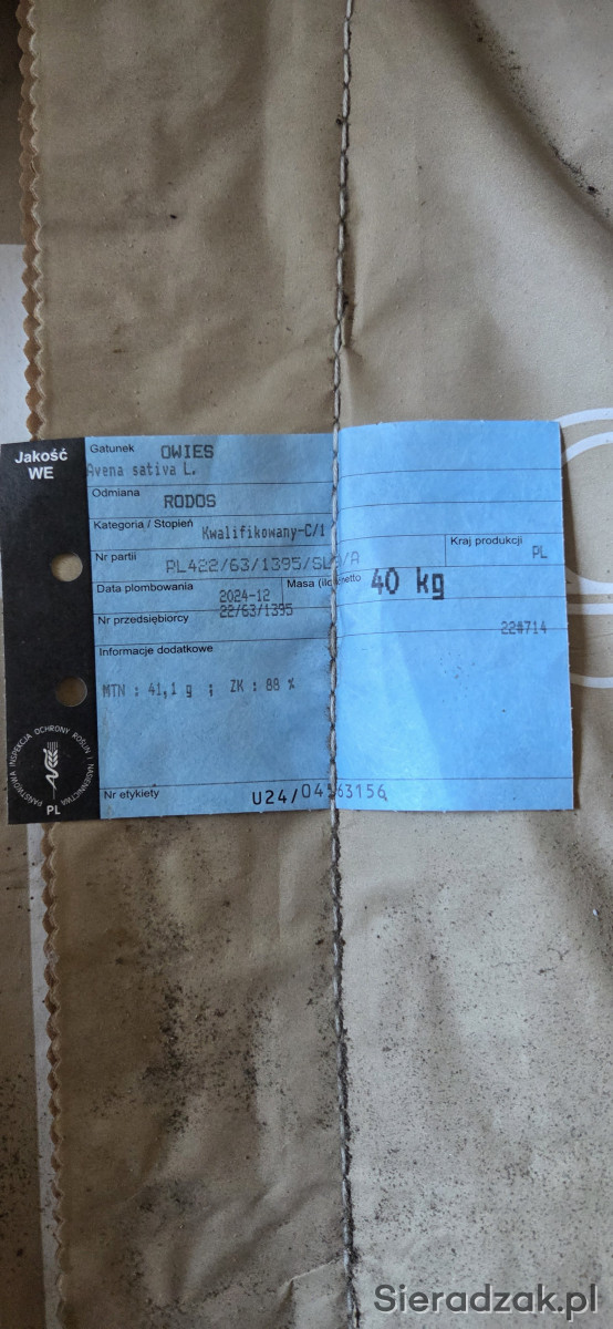 Witam do sprzedania ma Owies Kwalifikat 400kg na 2ha na palecie Gatunek Avena Sativa L odmiana Rodos. Tel 509 148 703