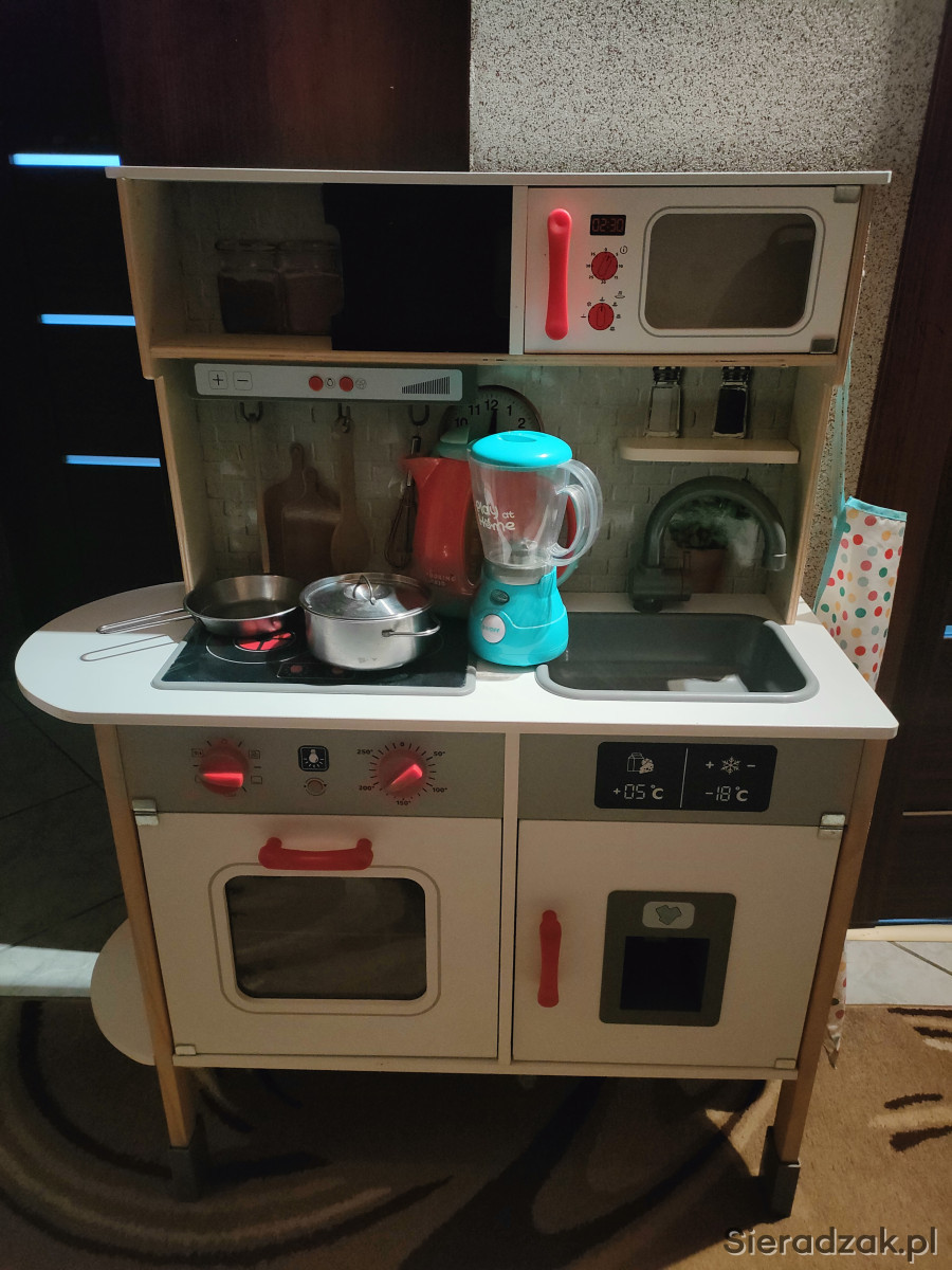Sprzedam kuchenkę drewnianą dziecięcą z oświetleniem i dźwiękiem, kostkarką do lodu, z czajnikiem elektrycznym i blenderem. Dołożę plastikowe naczynia(miski, talerze, sztućce, kubku,filiżanki) i plastikowe "jedzenie".