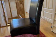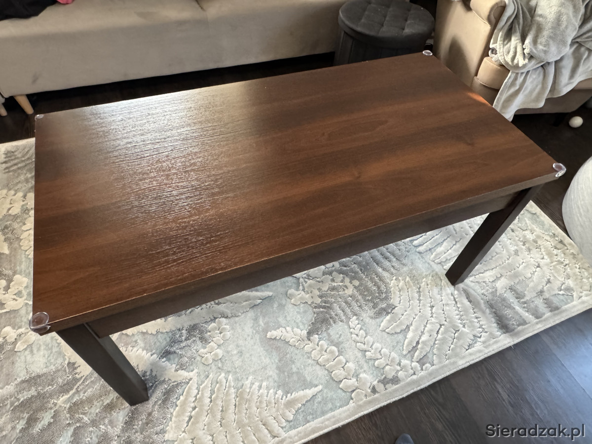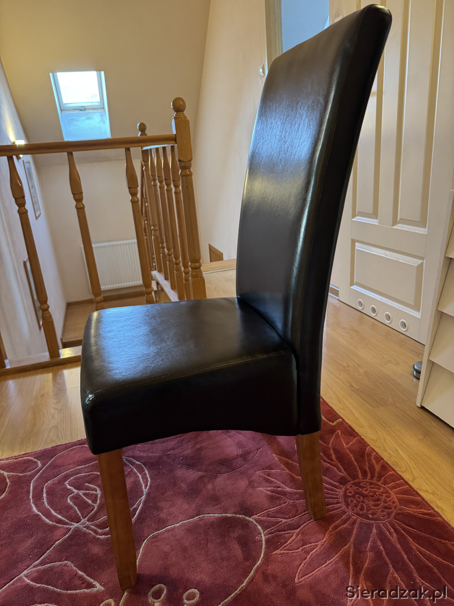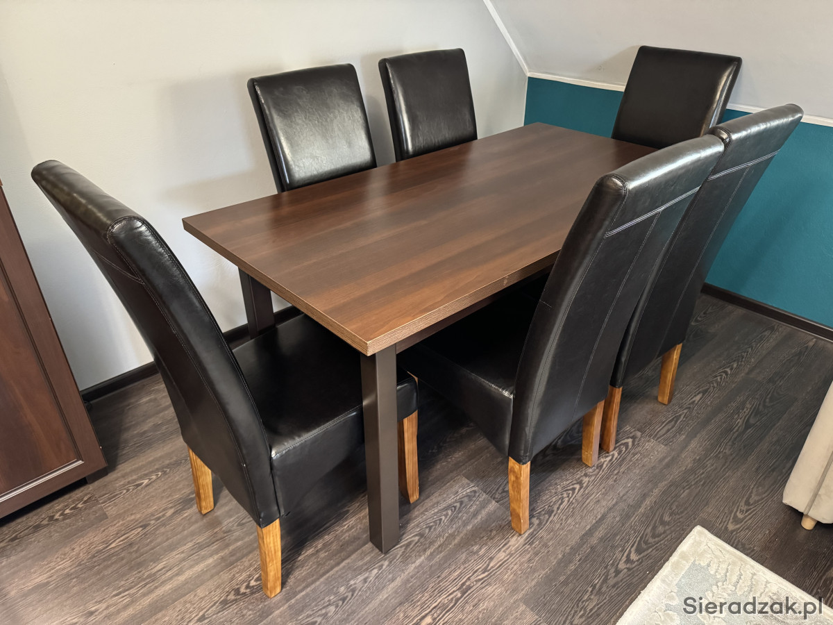 Solidny, prostokątny stół o wymiarach 155x80 i wysokości 80 cm w kolorze ciemnego dębu, z zestawem 6 wygodnych, czarnych, wykonanych z eko-skóry krzeseł o wysokości 107 cm, siedzisko 40x40x50 oraz stolikiem kawowym o wymiarach 120x60 wysokość 59 cm również ciemny dąb. Meble wykonane z wysokiej jakości materiałów, zapewniających trwałość i elegancki wygląd. Idealny zestaw do jadalni lub salonu, który nada wnętrzu charakter. Krzesła są w doskonałej kondycji, rzadko z nich korzystaliśmy tak naprawdę, stoliki noszą lekkie ślady użytkowania, stan oceniam na bardzo dobry.