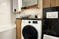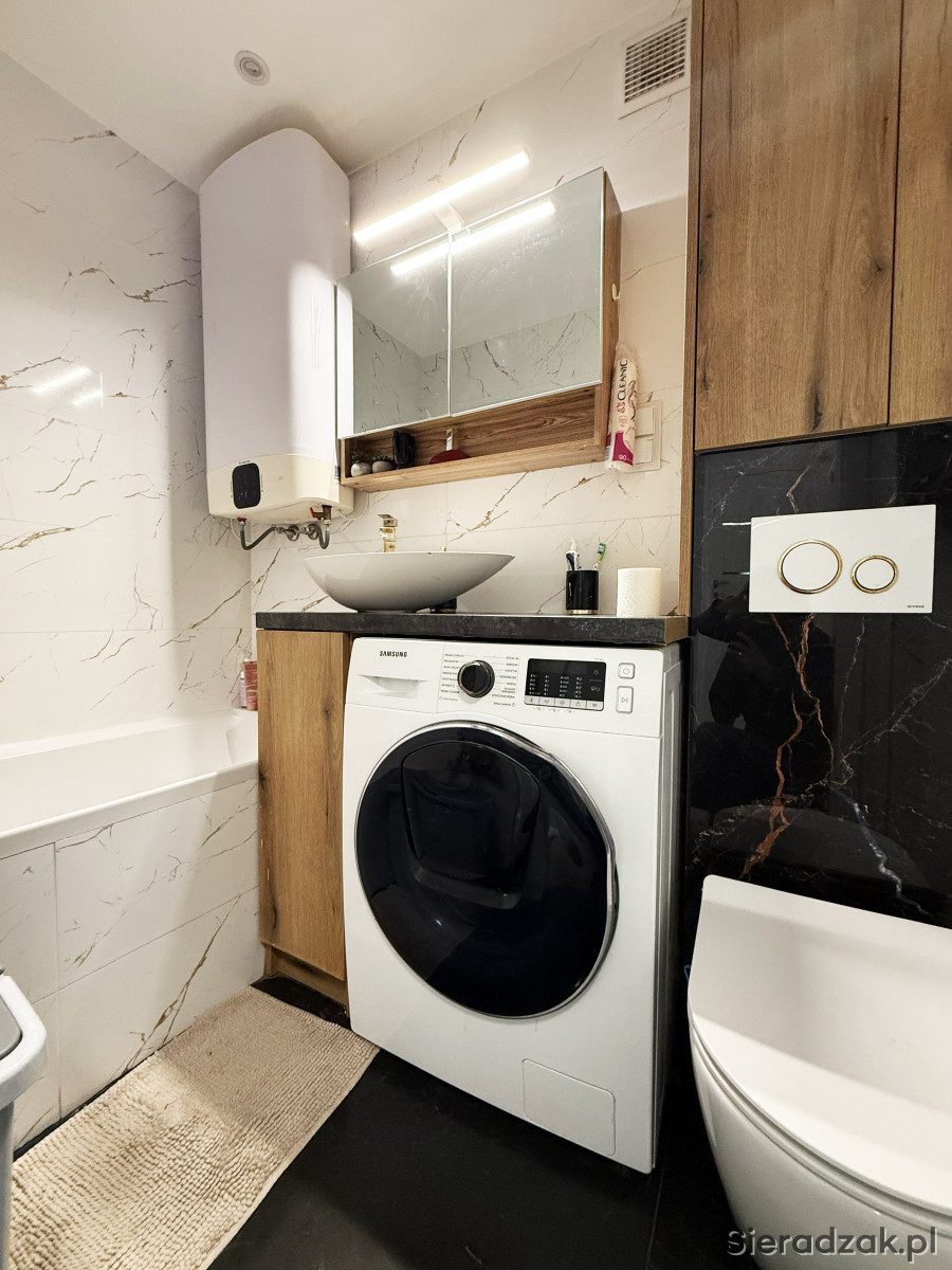 • Łazienka razem z wc, wyposażona w wannę oraz pralkę marki Samsung, glazura nowego typu;