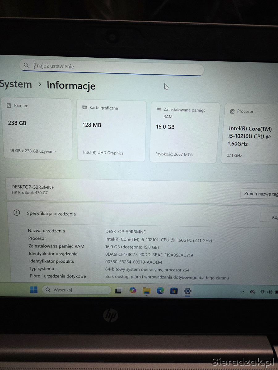 Na sprzedaż laptop premium, HP Probook 430 G7, jest to świeży oraz szybki sprzęt ponieważ posiada procesor i5-10 generacji, 16GB Ram DDR4 oraz 256GB dysk SSD M2 Nvme (jest możliwość dołożenia u mnie pamięci ram do 32gb jak i wymiana dysku na 512gb bądź 1tb).